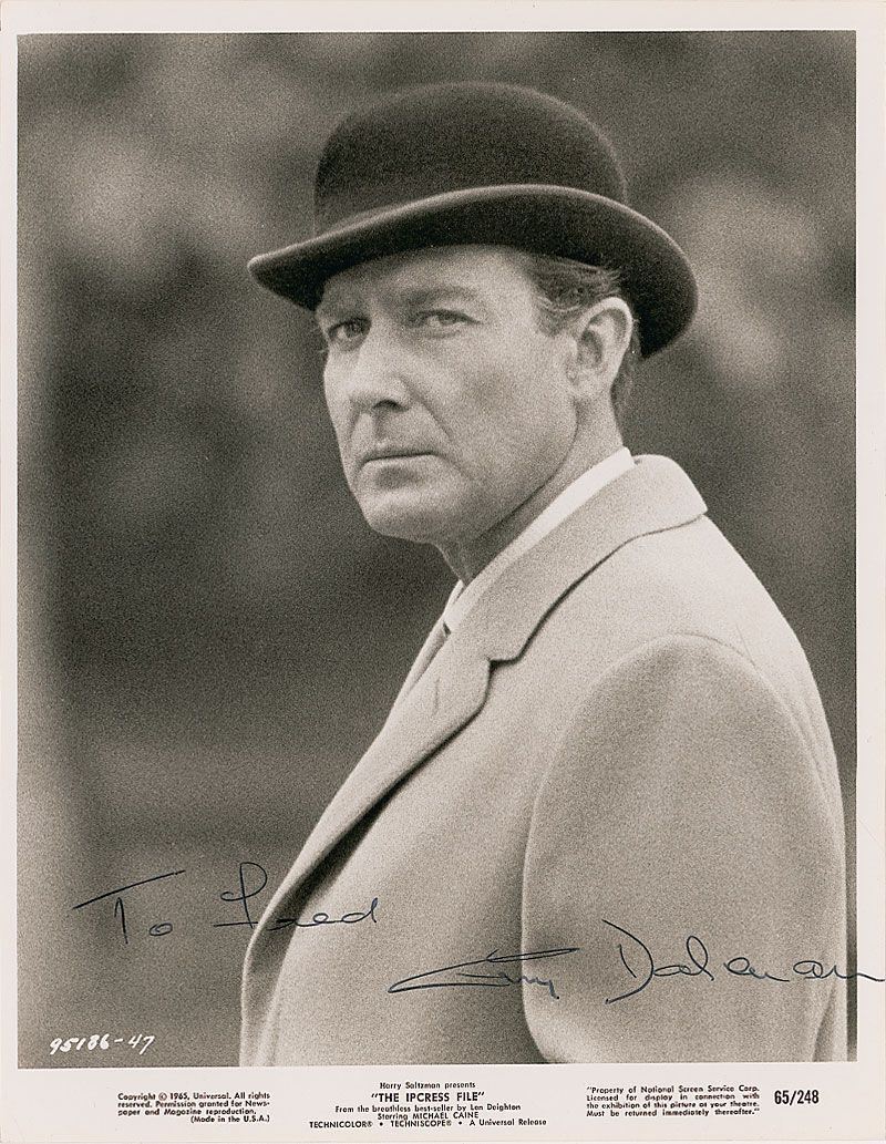 New Zealand actor (1923–1996) best known for his role as Count Lippe in the James Bond film Thunderball, and as Colonel Ross in the three film adaptations of Len Deighton's Harry Palmer novels. Glossy 8 x 10 Universal promotional photo for The Ipcress File, signed and inscribed in black felt tip “To Fred, Guy Doleman.” In fine condition, with some light horizontal streaking to finish.