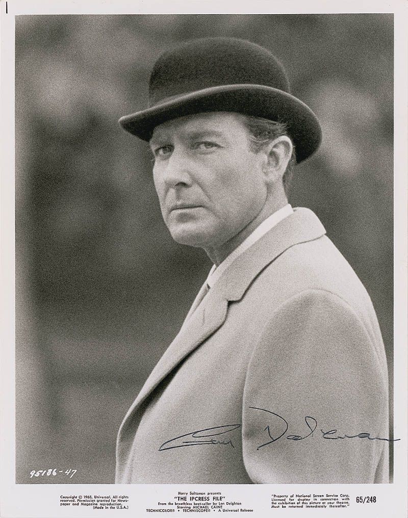 Glossy 8 x 10 Universal promotional photo of Doleman in The Ipcress File, signed in black felt tip. In fine condition, with scattered surface creases and impressions.