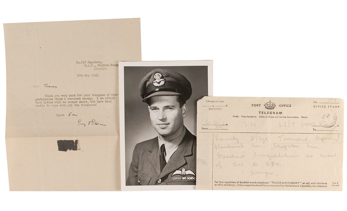 First CO of the Royal Air Force's 617 Squadron, which he led in the ‘Dam Busters’ raid in 1943, resulting in the destruction of two large dams in the Ruhr area and being awarded the Victoria Cross. War-dated TLS, one page, 7 x 8.75, May 30, 1943. Short letter of thanks for a telegram sent after his Dam Busters raid. In full: “Thank you very much for your telegram of congratulation which I received to-day. I am afraid this letter will be rather short, but have been unable to cope with all the telegrams!” In very good condition, with intersecting folds, a uniform shade of toning, and some mounting remnants to lower blank portions. Accompanied by a congratulatory telegram from the same year, signed “Wingco,” as in ‘Wing Commander’ and a nice 4.75 x 6.5 unsigned photo of Gibson