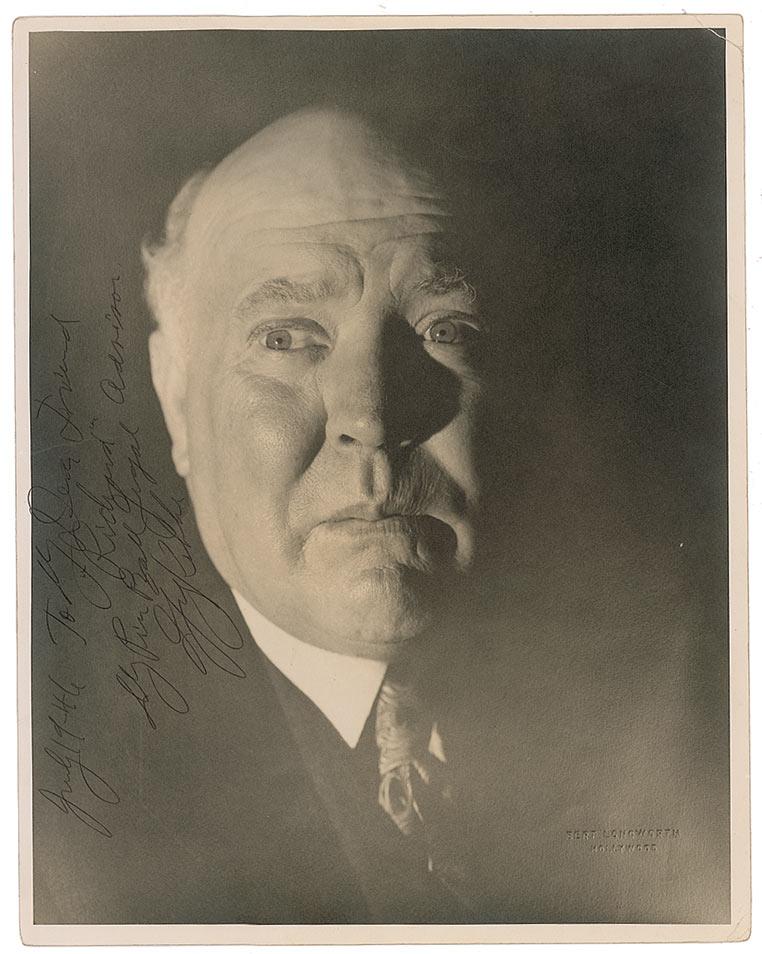 Vintage matte-finish 11 x 14 eerily shadowed photo, signed and inscribed vertically in fountain pen, “July 19-46, To My Dear Friend ‘Richard’ Gigal, My Pin Ball Advisor, Guy Kibbee.” Moderate rippling and creasing to top edge, heavier crease towards right corner, light corner creasing and mild silvering, otherwise fine condition.