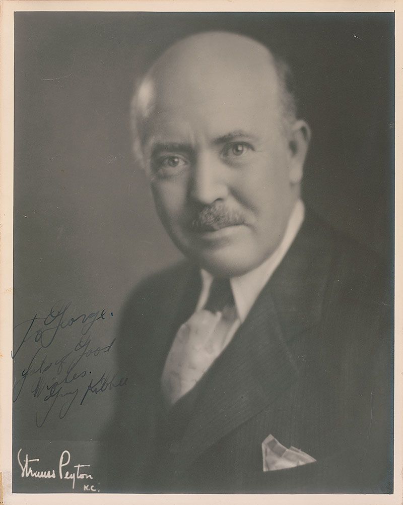 Vintage matte-finish 8 x 10 photo, signed and inscribed in fountain pen to assistant director George Rhein, “To George, Lots of good wishes, Guy Kibbee.” A few scattered surface marks and creases, trivial repaired hole to top right, and a lightly trimmed lower left edge, otherwise fine condition.