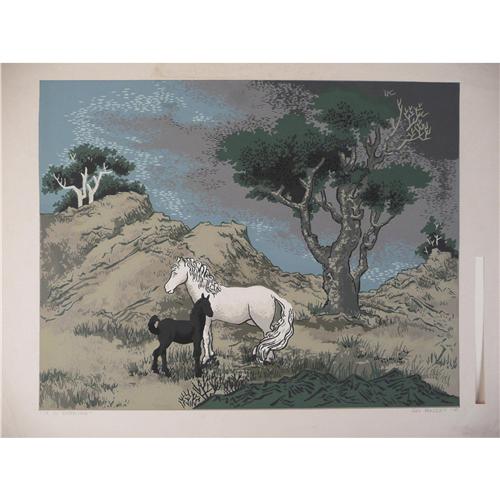 Guy MacCoy (1904-1981), Color Silkscreen, "It is Evening", 14" x 11", Pencil signed lower right, "49, 5" x 1/4" strip has been cut on rightside margin.
