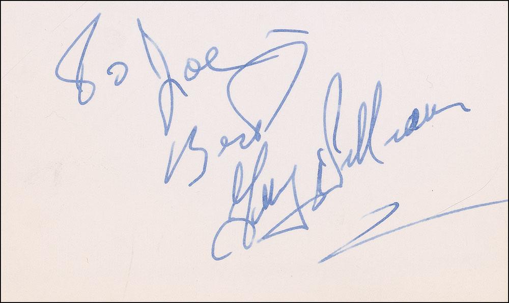 Dashing actor (1924–1989) best known for his television roles as Zorro and Professor John Robinson on Lost in Space. Vintage ink in-person signature and inscription, “To Joe, Best, Guy Williams,” on an off-white 5 x 3 card. In very fine condition.