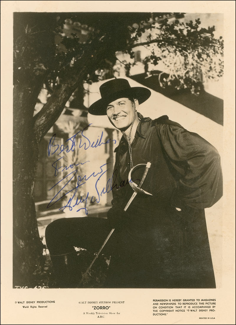 Vintage matte-finish 5 x 7 Walt Disney Productions publicity photo of Williams as Zorro, signed in blue ballpoint “Best Wishes From Zorro, Guy Williams.” In fine condition with some faint silvering to some of the darker portions.