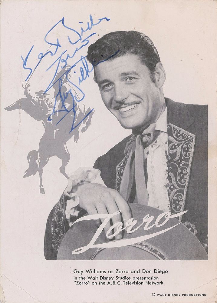 Vintage glossy 5 x 7 Walt Disney publicity cardstock photo of Williams as Don Diego, with an image of Zorro in the background, signed in blue fountain pen, "Best wishes, Zorro, Guy Williams," adding a "Z" below. Reverse postmarked November 25, 1958. In fine condition, with a few creases. From the Harvey and Rhoda Kuflik Collection.