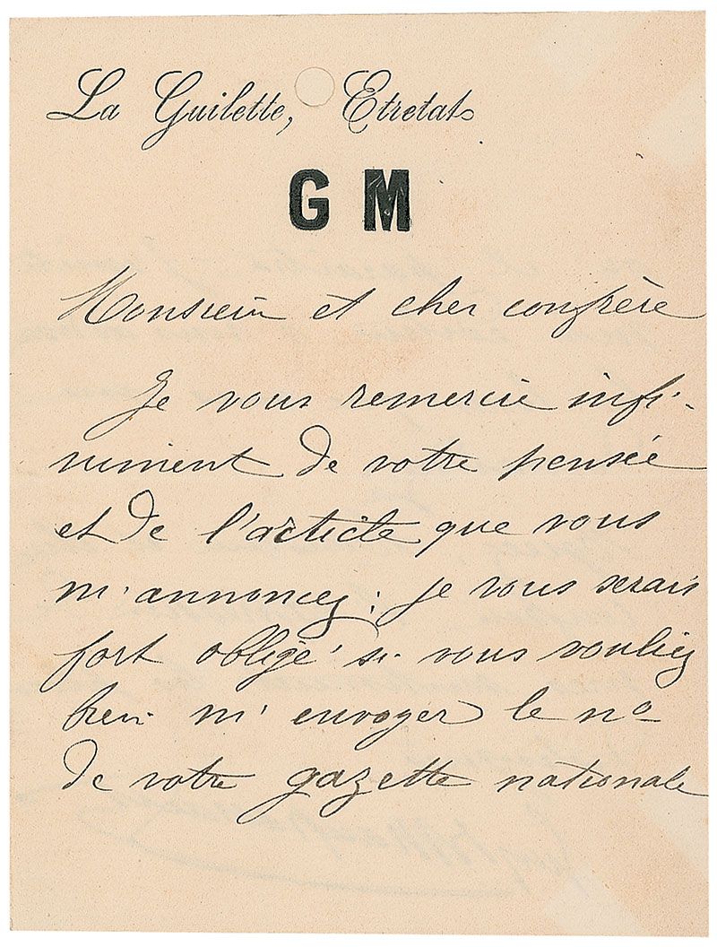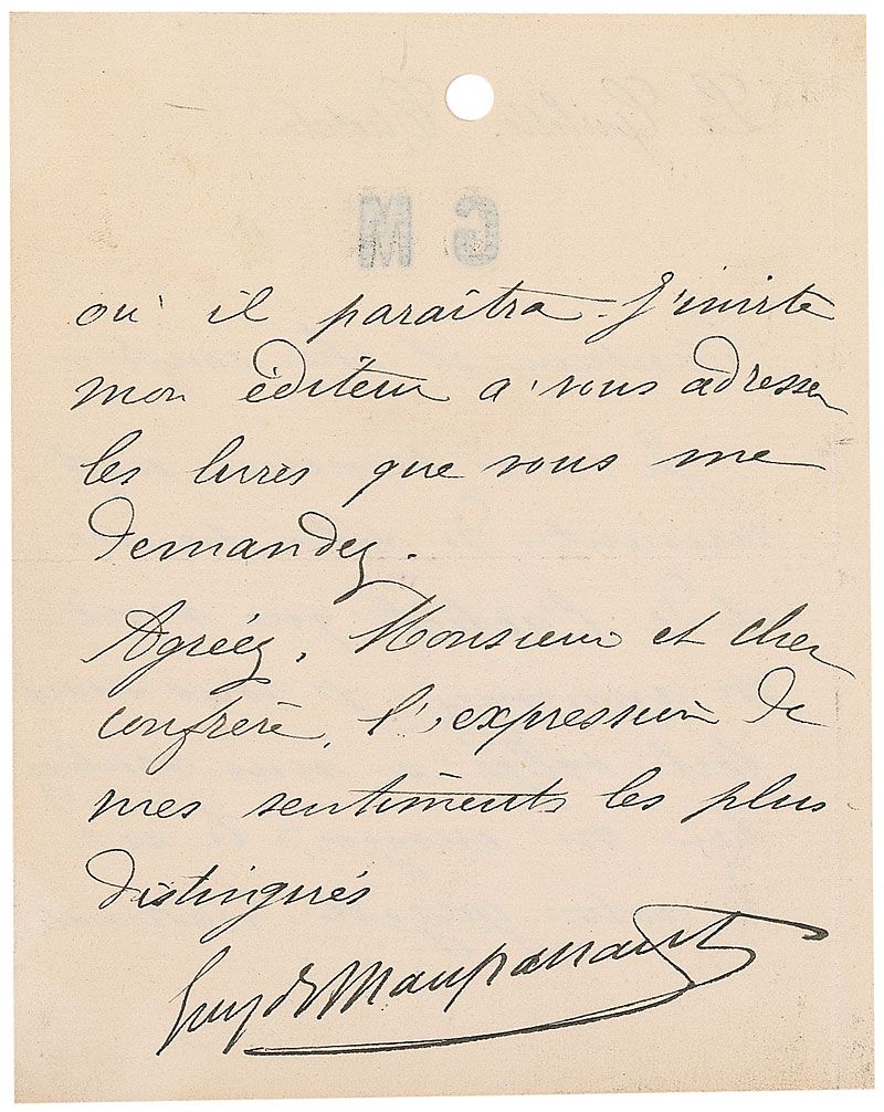 French naturalist writer (1850–1893), considered the greatest French author of short stories. ALS in French, one page both sides, 3.75 x 5, personal letterhead, no date. Untranslated letter to a gentleman. In fine condition, with light scattered toning and a filing hole to the top.