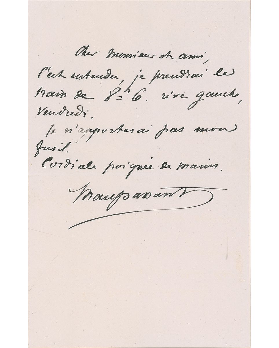 Boldly penned ANS in French, signed “Maupassant,” one page, 4.5 x 7, no date. A brief confirmation of a meeting. In part (translated): “It is understood, I will take the train at 8 am…I will not bring my gun.” In fine condition.