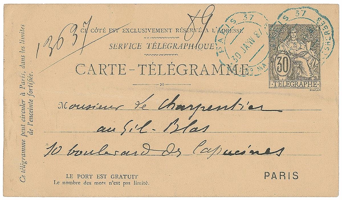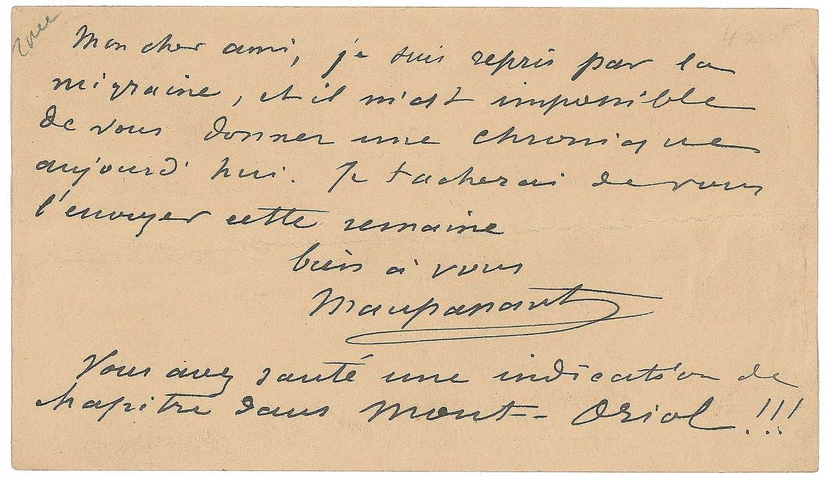 ALS in French, signed “Maupassant,” one page on a 5 x 3 postcard, January 30, no year. In part (translated): “I am taken with a migraine, and it is impossible for me to give you a review today.” Addressed on the reverse in Maupassant’s own hand. In fine condition, with a central horizontal crease, handling wear.
