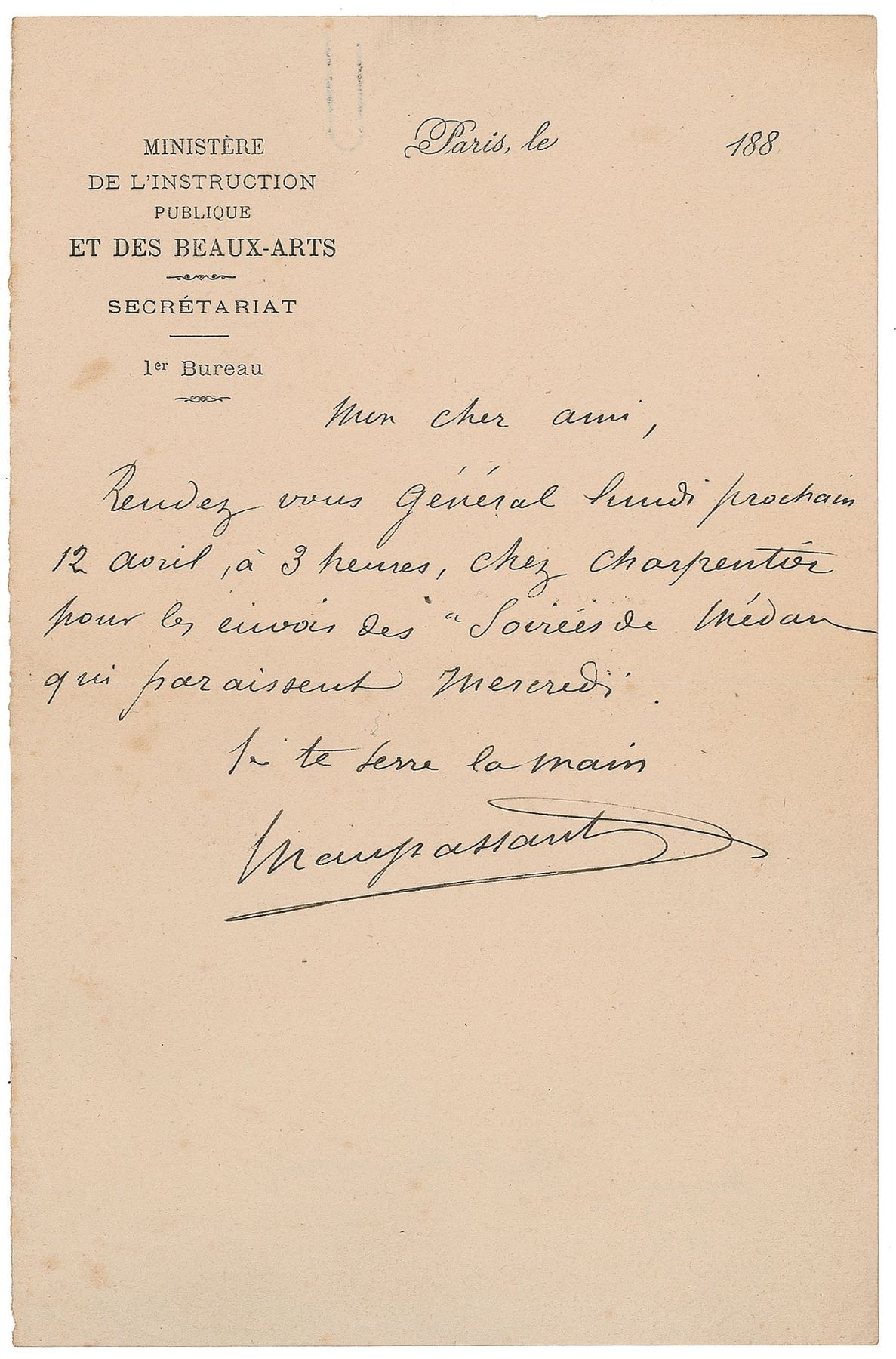 French naturalist writer (1850–1893) considered the greatest French author of short stories. ALS in French, signed “Maupassant,” one page, 5.25 x 8, Ministre de l'Instruction Publique et des Beaux-Arts letterhead, no date. Untranslated letter to a friend, mentioning the short story collection Les Soirees de Medan. In fine condition, with scattered light foxing and a paperclip impression to the top edge. Les Soirees de Medan was a collection of six short stories authored by Zola, Guy de Maupassant, Joris-Karl Huysmans, Henri Ceard, Leon Hennique, and Paul Alexis; the title was taken from the name of Zola's home near Versailles, where the writers often gathered together.