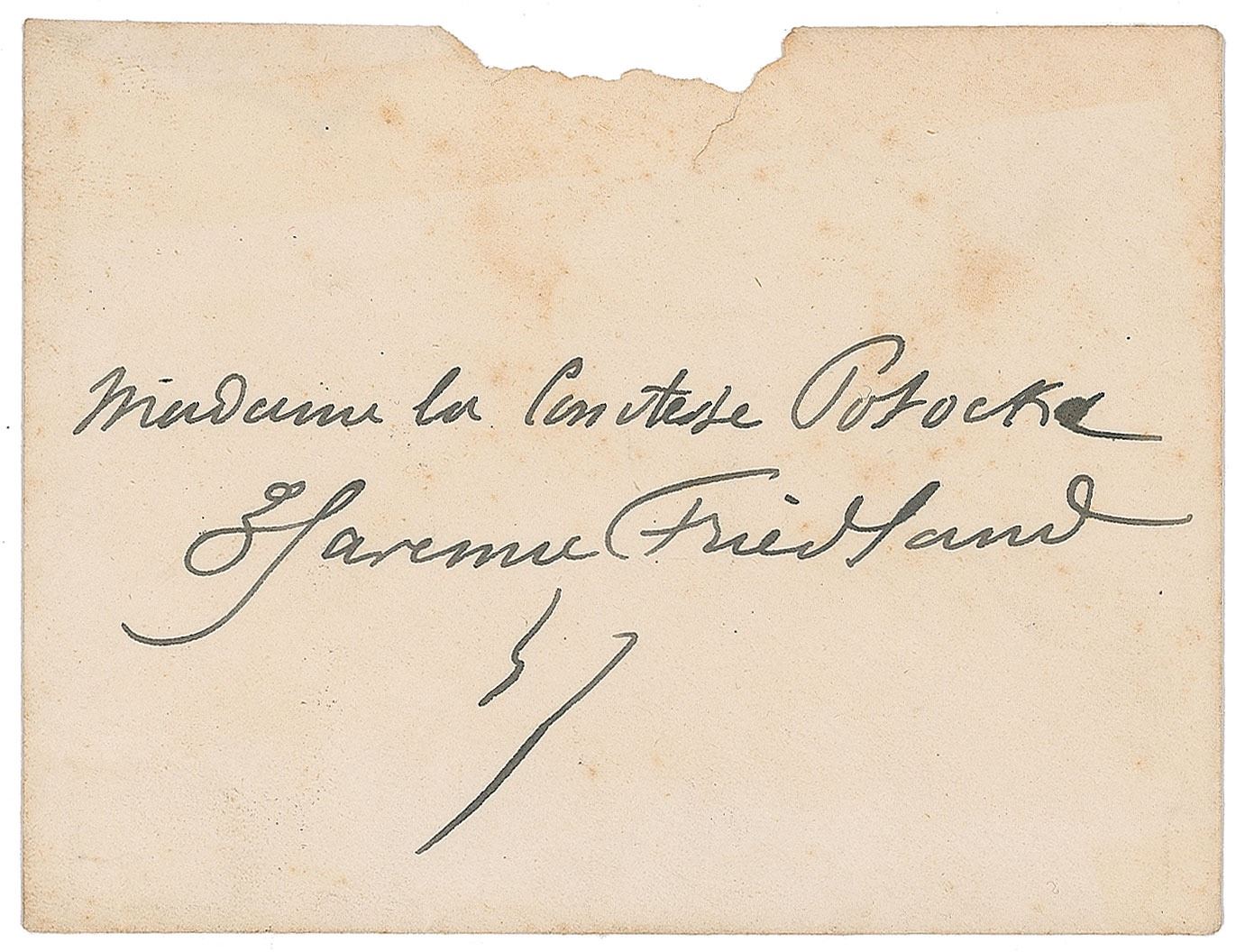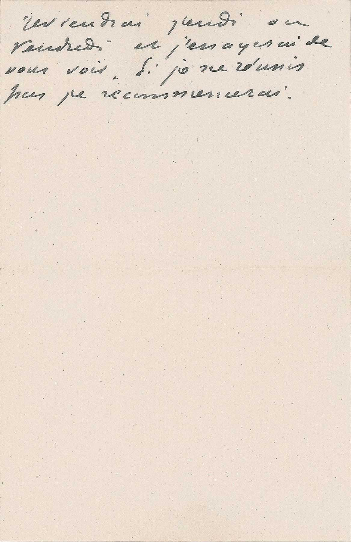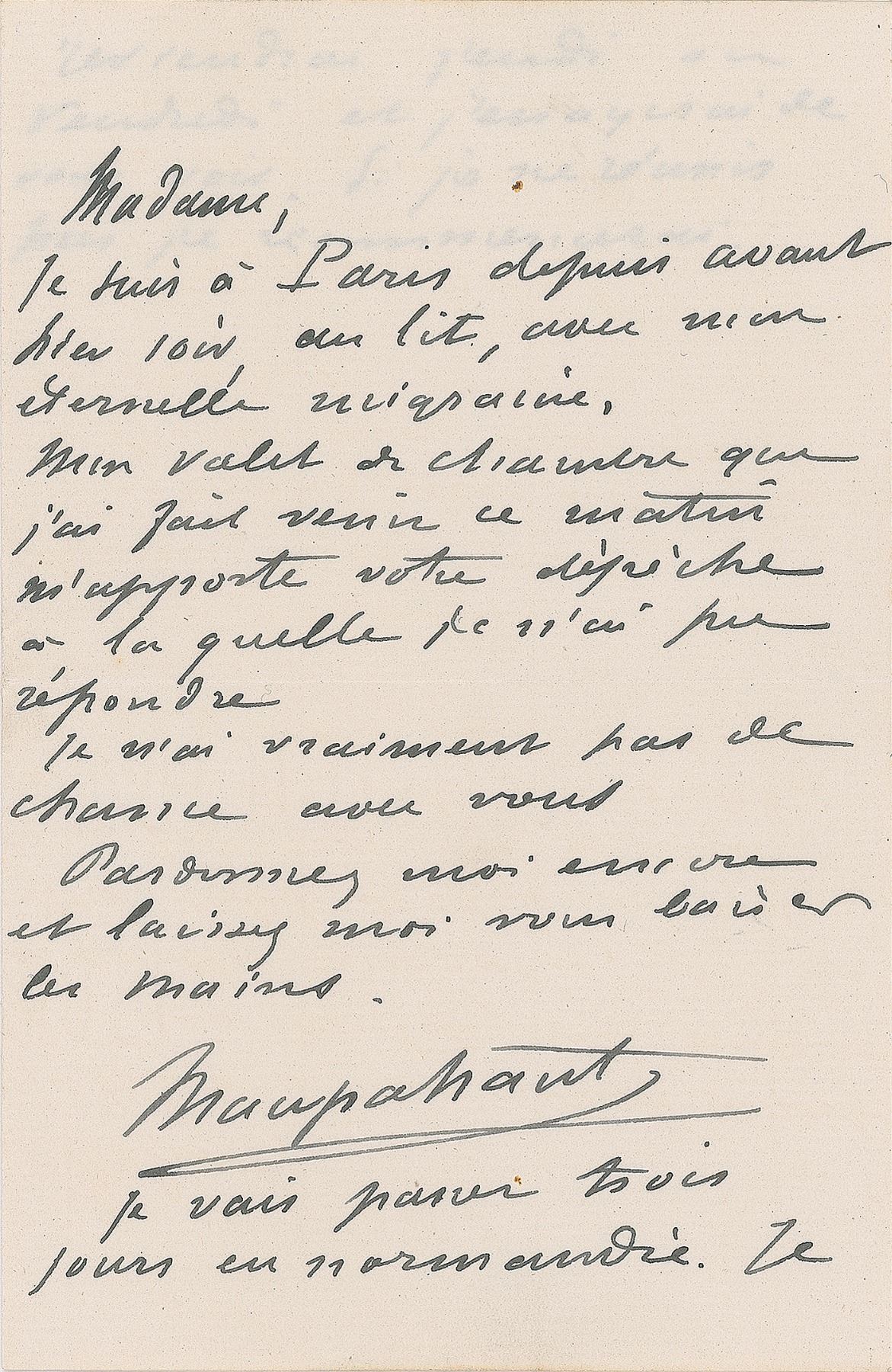 French naturalist writer (1850–1893) considered the greatest French author of short stories. ALS in French, signed “Maupassant,” two pages on two adjoining sheets, 4 x 6, no date but circa July 1888. Letter to the Countess Emanuela Potocka, in part (translated): "I have been in Paris since the night before yesterday, in bed, with my eternal migraine. My valet, whom I had sent for this morning, brings me your despatch, to which I could not reply. I really do not have a chance with you. Forgive me again and let me kiss your hands. Maupassant. I will spend three days in Normandy. I will come back Thursday or Friday and I will try to see you. If I do not succeed, I will do it again." Maupassant's short postscript extends onto the second integral sheet. In fine condition. Accompanied by the original mailing envelope addressed in Maupassant's hand. Potocka was an important and fashionable saloniere in Paris, visited by the likes of Proust, Maupassant, and other literary and artistic figures of the day.