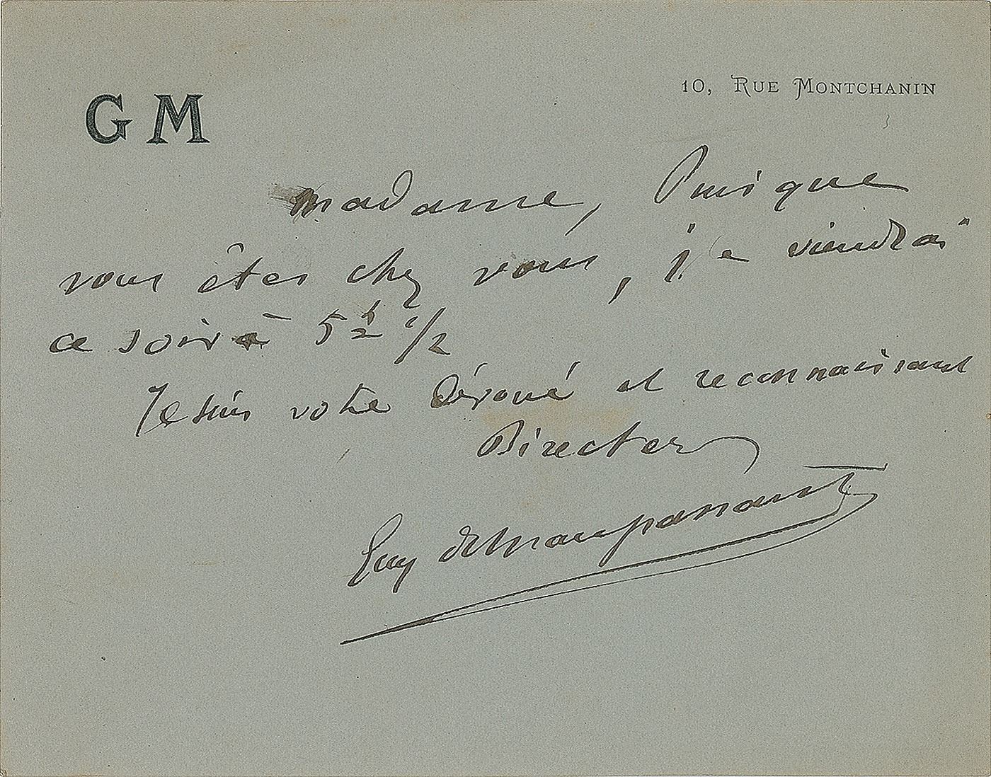 French naturalist writer (1850–1893) considered the greatest French author of short stories. ALS in French, signed “Guy de Maupassant,” one page, 4.5 x 3.5, personal monogrammed letterhead, no date but circa 1884–1885. Letter to the Countess Emanuela Potocka, in full (translated): "Because you are at your home, I will come this evening at 5 1/2. I am your devoted and recognizing director." In fine condition. Potocka was an important and fashionable saloniere in Paris, visited by the likes of Proust, Maupassant, and other literary and artistic figures of the day.