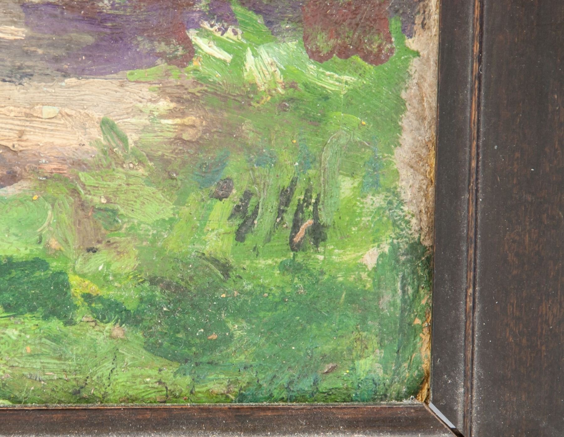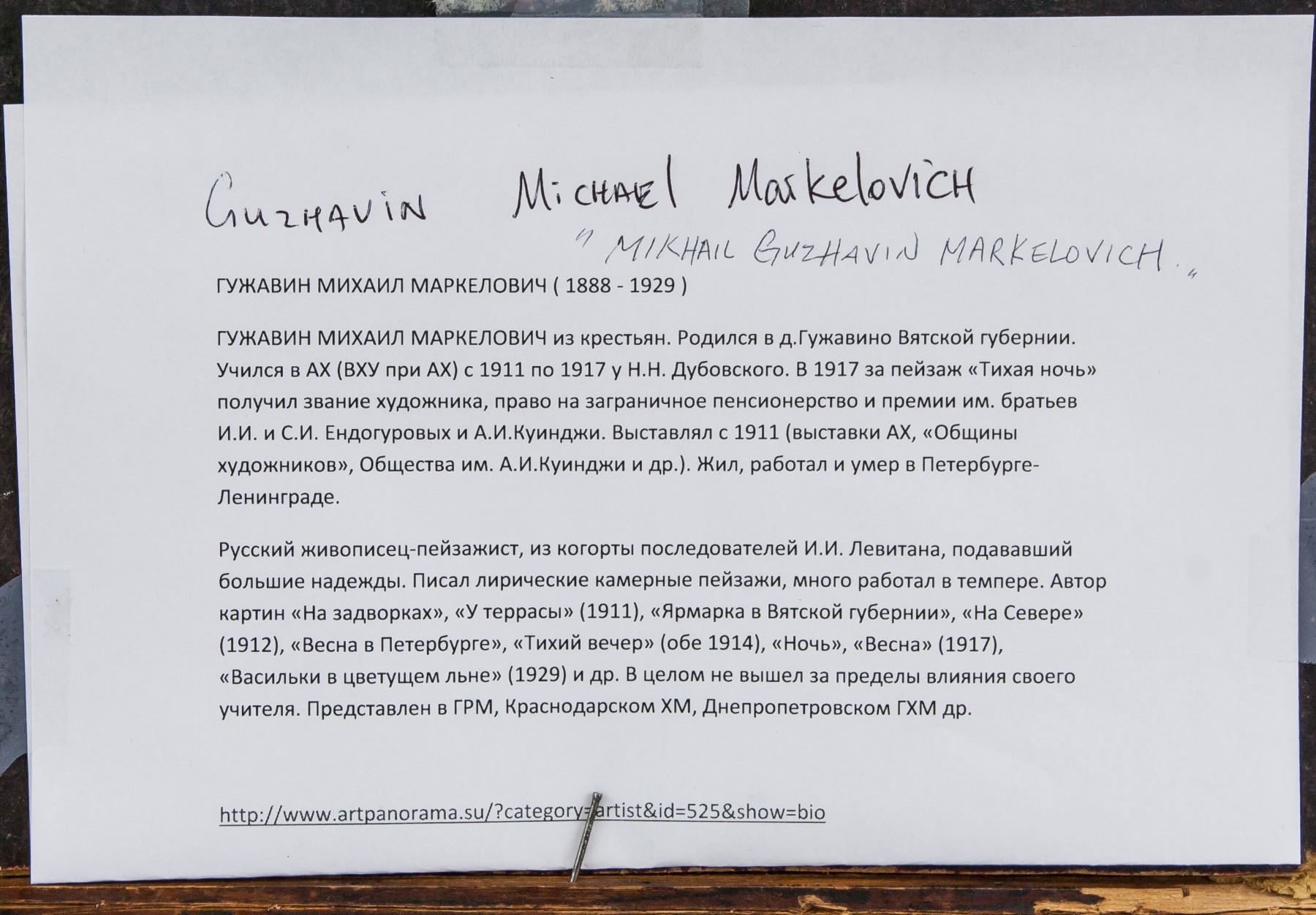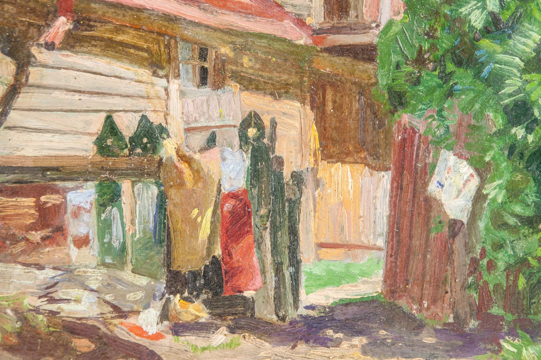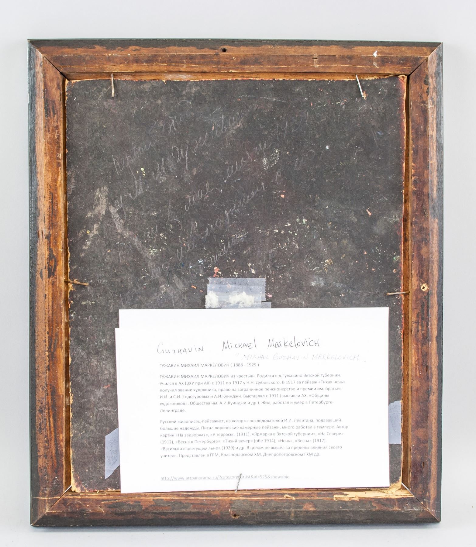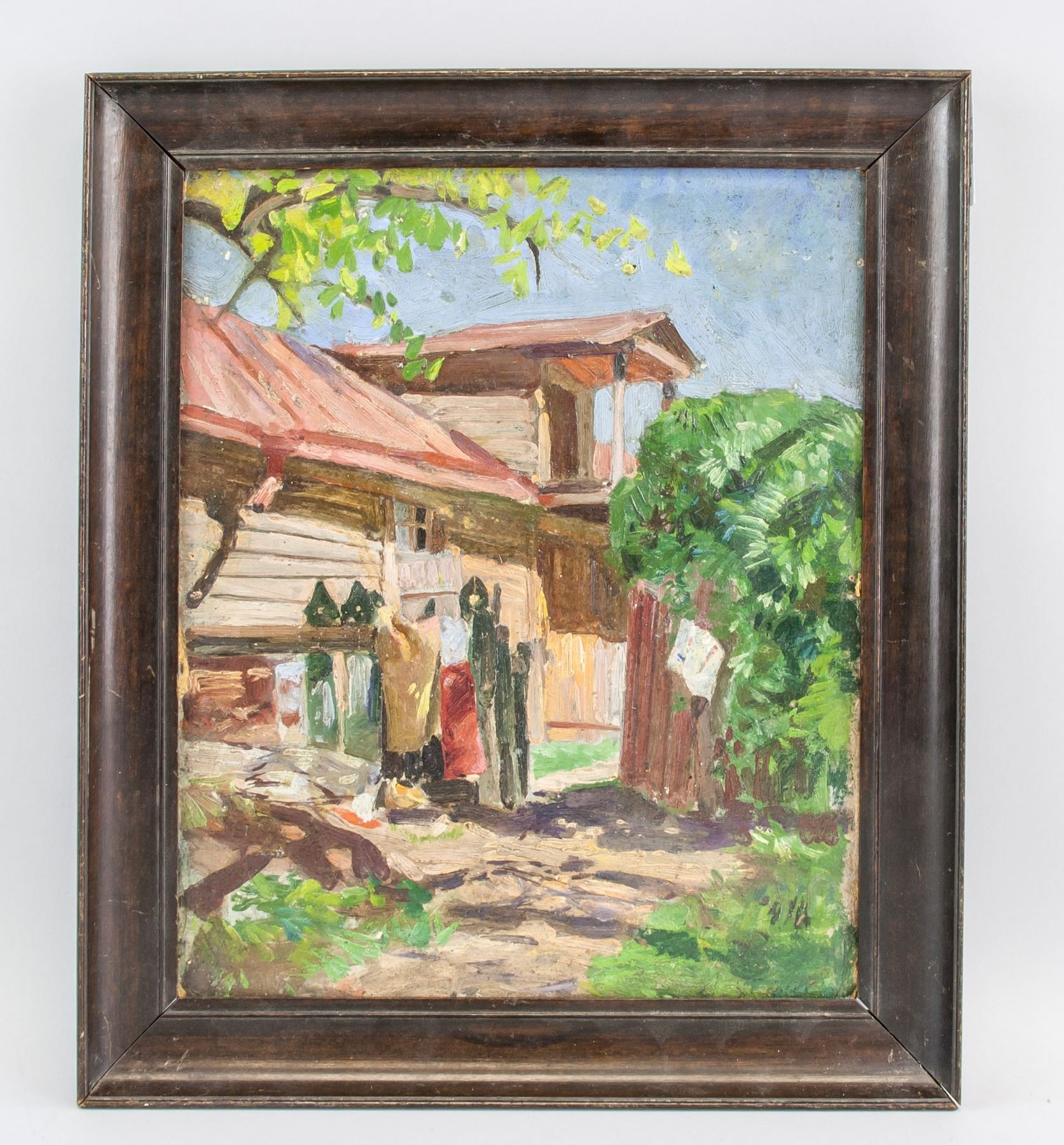 Oil on board painting, featuring a home and landscape scene. Signed and attr. Guzhavin Michael Maskelovic, Miikhail Guzhavin (Russian, 20th Century. Small biography written in cyrlic on verso. 12.5 x 10.5 in (31 x 27 cm). PROVENANCE: Private collection, North York, ON