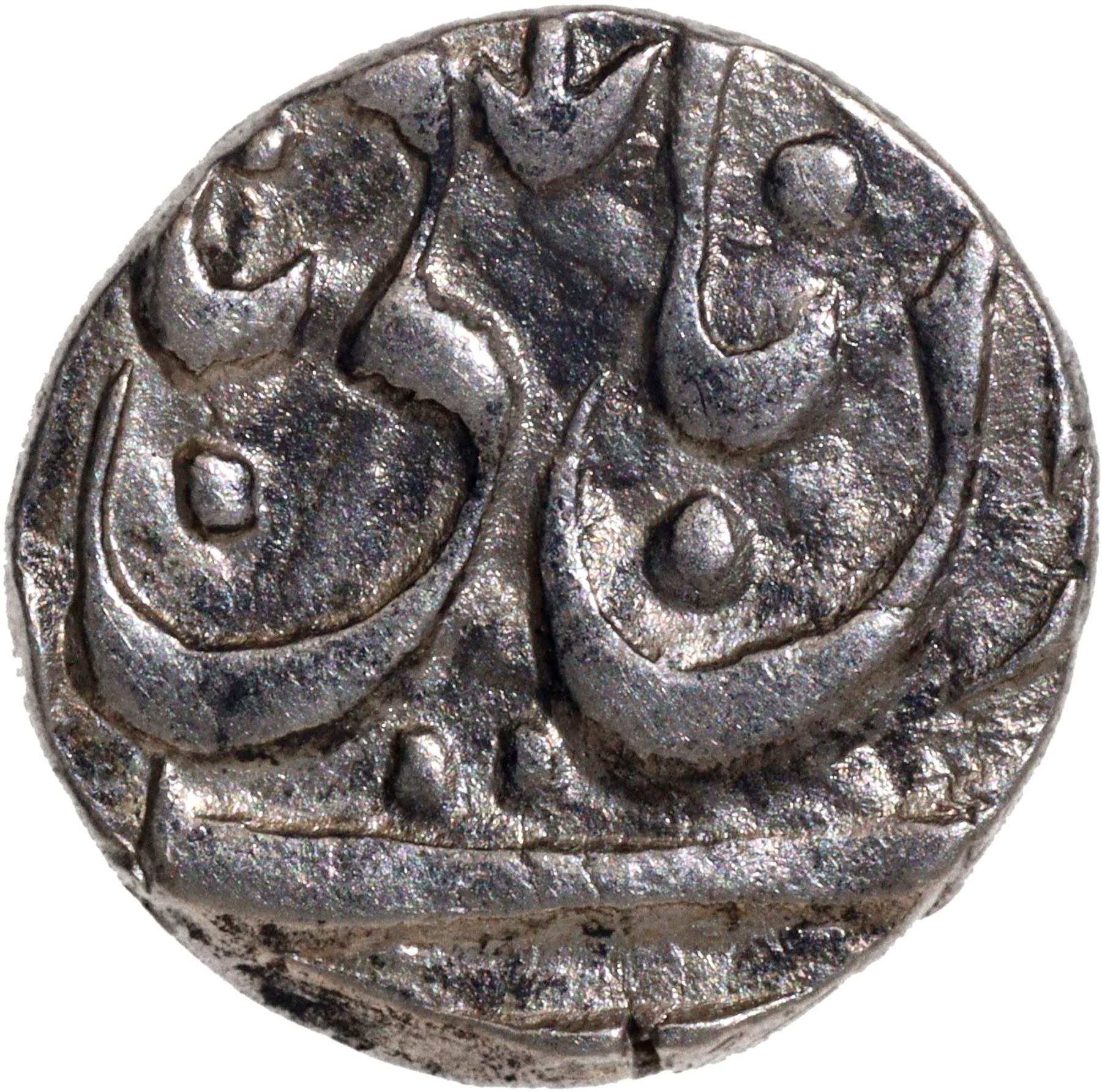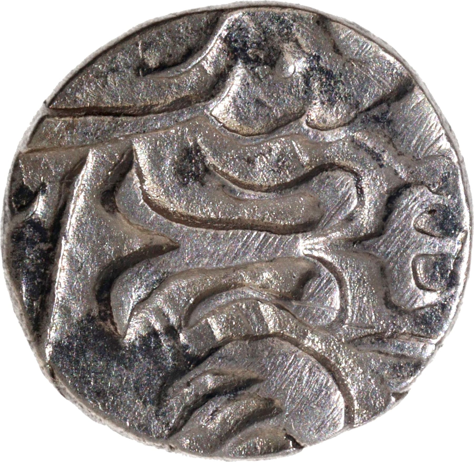 Gwalior State, Jankoji Rao (AH 1243-1259 / 1827-1843 AD), Basoda Mint, Silver ¼ Rupee, In the name of Muhammad Akbar II, Obv: Persian legend "Sikka Mubarak saheb-e-qiran Badshah Ghazi", Rev: Persian legend "sana julus" & mint mark, 2.62g, 14.09mm (KM # A19), no test mark, about extremely fine, Very Rare.