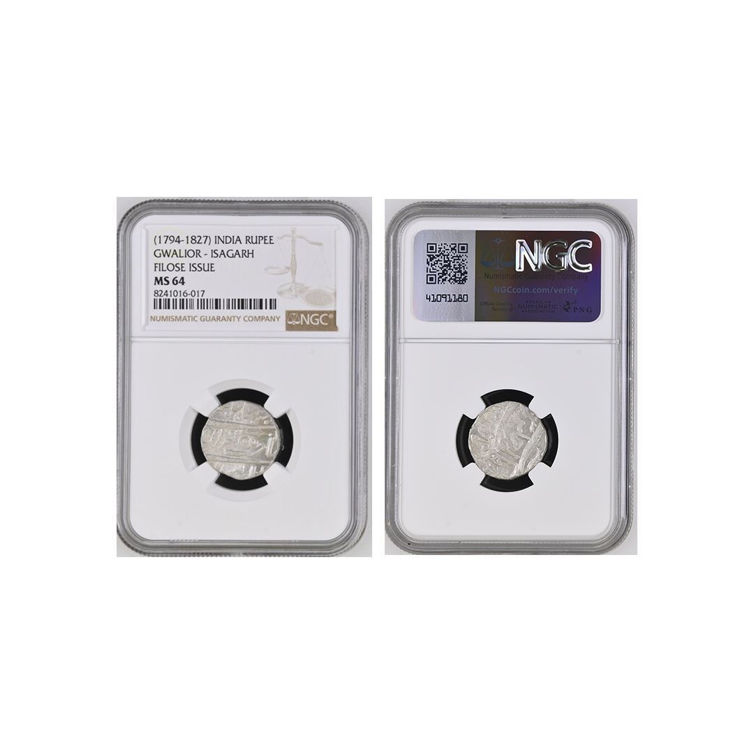 Gwalior, Daulat Rao Sindhia (1794-1827 AD), Silver Rupee, Isagarh Mint, in the name of Muhammad Akbar II, struck under the authority of Jean-Baptiste Filose; cannon and snake symbols on obverse and fly-whisk (chauri) and battleaxe symbols on reverse.Graded MS64 by NGC, Rare.