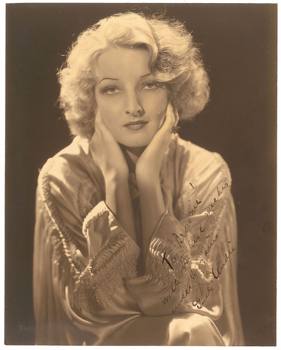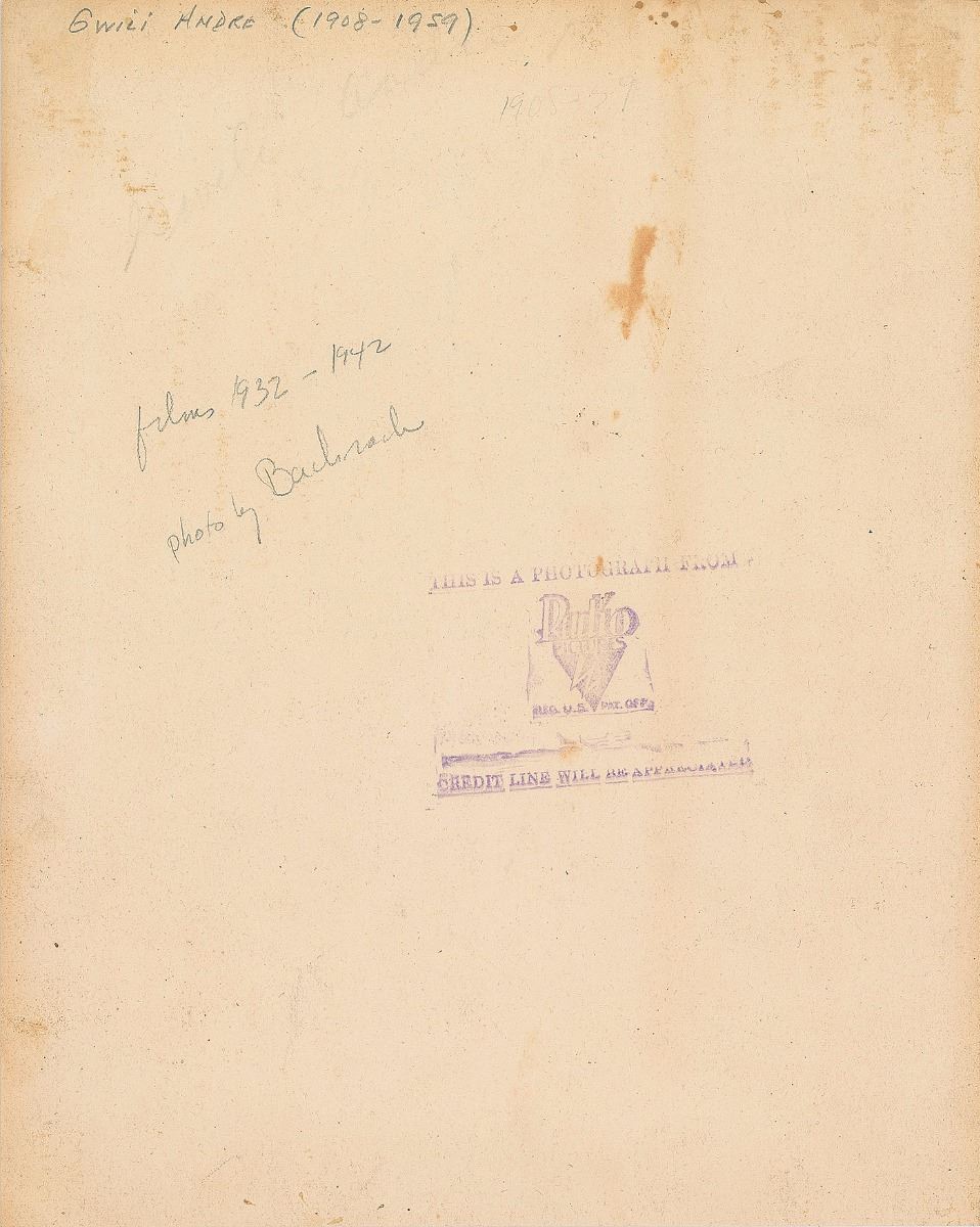 Danish actress and model (1908–1959) whose considerable beauty was likened to that of Greta Garbo and Marlene Dietrich. Mesmerizing vintage matte-finish 7.25 x 9 Bachrach portrait of Andre gently holding her hands to her cheeks, signed and inscribed in fountain pen, “To Brownie! With my best wishes, sincerely yours, Gwili Andre.” Photo bears an Ernest A. Bachrach blindstamp to the lower left, as well as a Radio Pictures ink stamp to reverse. In fine condition, with slightly trimmed edges. A glowing image of the actress, this is just the fourth Andre signed photo we have ever offered.