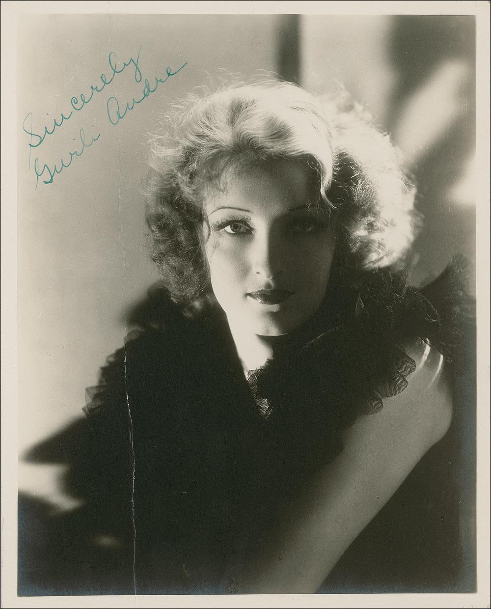 Danish actress known more for her bizarre suicide than her brief Hollywood career. In 1959, she surrounded herself with reams of publicity photos and press clippings, all of which represented the fame she had expected but hadn’t achieved, set the paper alight, and allowed herself to be consumed by the fire. Mesmerizing and very scarce vintage matte-finish 8 x 10 photo, signed in green fountain pen. In very good condition, with a noticeable vertical crease to left side, affecting a single letter of signature and sentiment. Only the second Andre item we have seen, and the first signed photo.