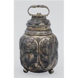 Lipcse, 17. sz., antik ezüst, részben aranyozva, "DM" mesterjegy, oldalain trébelt virágszálak, tagozott, csavaros fedelén kengyeles, lehajtható fül, apró sérüléssel, 360 g; m: 15 cm
