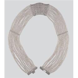 20. sz. utolsó harmada, 9 soros tenyésztett gyöngysor, 1135 db 3 mm -es gyöngybol, 18 k fehér arany, 327 db briliánsokkal ékített középtag és csat, cca 2,25 ct, MTCrSi, br. 99,8 g