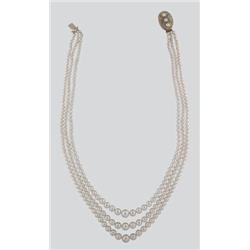 3 soros, 8 mm -es Verlauf fuzésu, fehér tenyésztett gyöngyszemekbol, 14 k fehér arany ovális csattal, br. 42,8 g