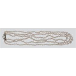1920 körül, háromsoros tenyésztett gyöngysor 4 - 6 mm -es szemekbol , 14 k fehér és sárga arany csattal, 4 db briliáns, cca 0,40 ct, R2TCrSi 1 db 7 mm -es gyöngyszem, nyelves záródással, br. 26,6 g