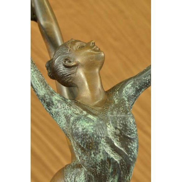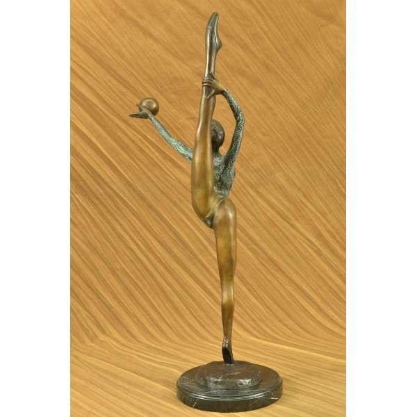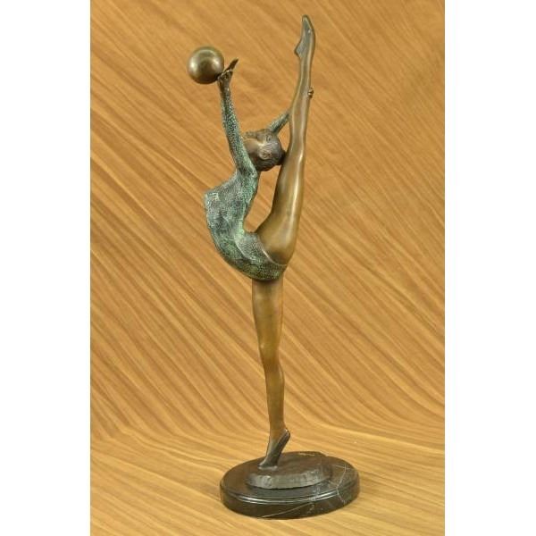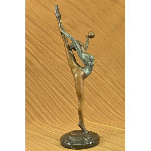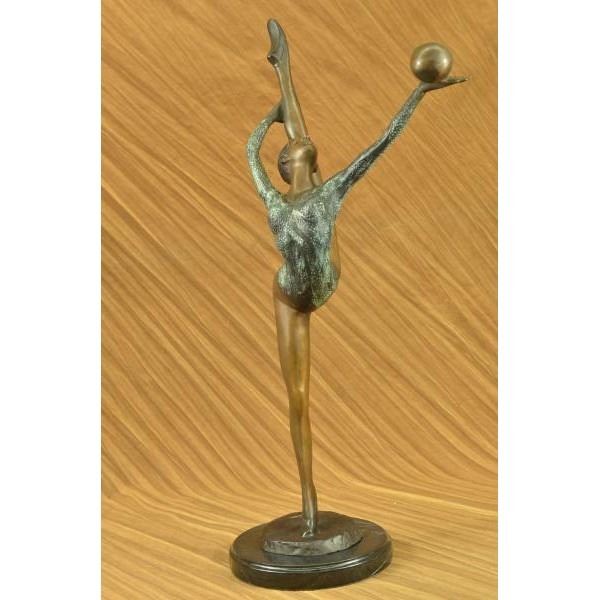 The rhythmic gymnast. Captured in the midst of her ball routine, she flaunts her toned body and flexibility ever so humbly. Reaching all the way back, she gently grasped the ball with her fingertips, arching her spine in full stretch. Her hair is neatly styled into a bun so that it will not interfere with her elegant performance. The gymnast's flawless physique is also masked by a full body suit, accompanied by ballet shoes to protect her soles. This Bronze statue is made completely of lost wax, with a beautiful patina texture, and a cleanly aged green for her attire and Placed upon a marble base. Dimensions: Height 24 X 12 inches. Weight: 10 LBS.