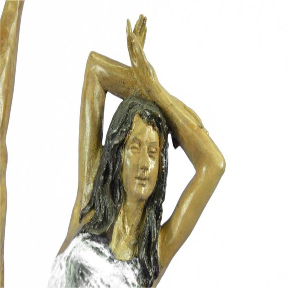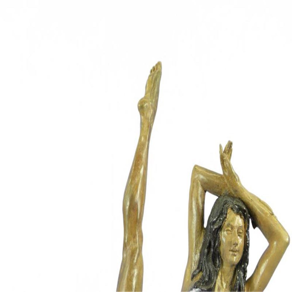 This woman is a talented Gymnast demonstrating her agility and flexibility. Balancing on one foot as she has her other feet stretched in the air. Her muscular legs curve backwards and rests in her hands on her head. She is semi nude that highlights her athletic body. This Sculpture was crafted using the lost wax method and it mounted on a black marble base. Bronze Dimensions with Marble Base: Height 25 X 10 inches. Weight: 16 LBS.
