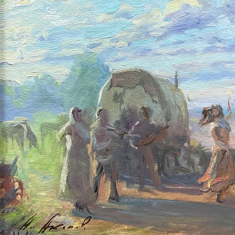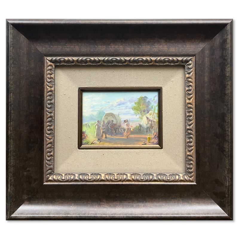 "Gypsies" is an original oil painting on board by Alexander Akopov, hand signed by the artist. This piece comes framed. Includes Letter of Authenticity. Measures approx. 15" x 17" (frame), 4.5" x 6" (image). There is some wear on the frame.