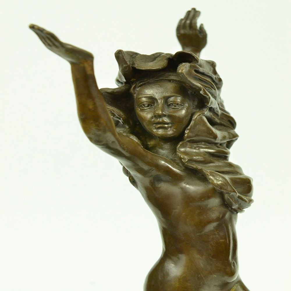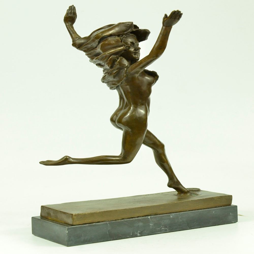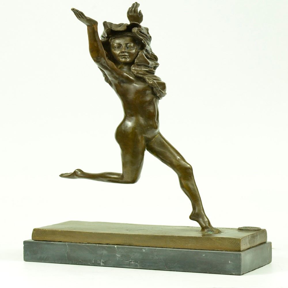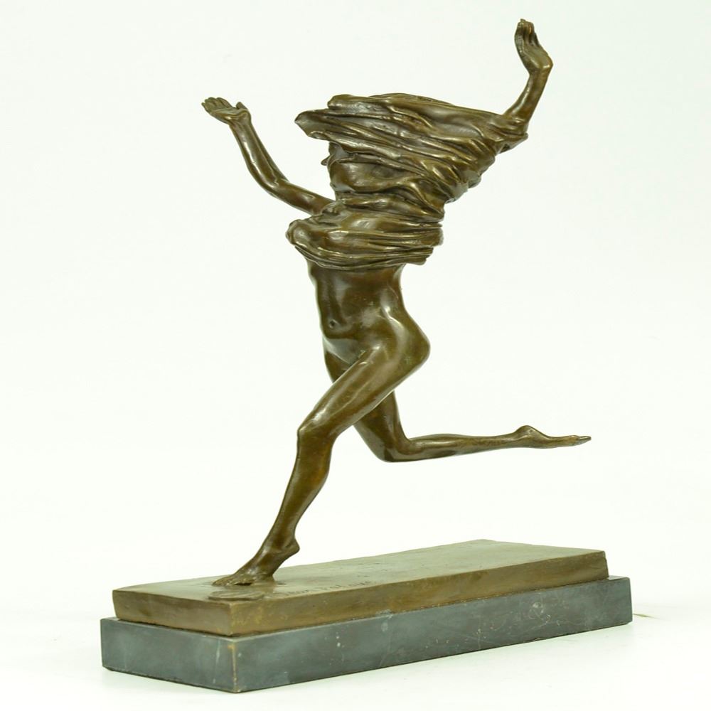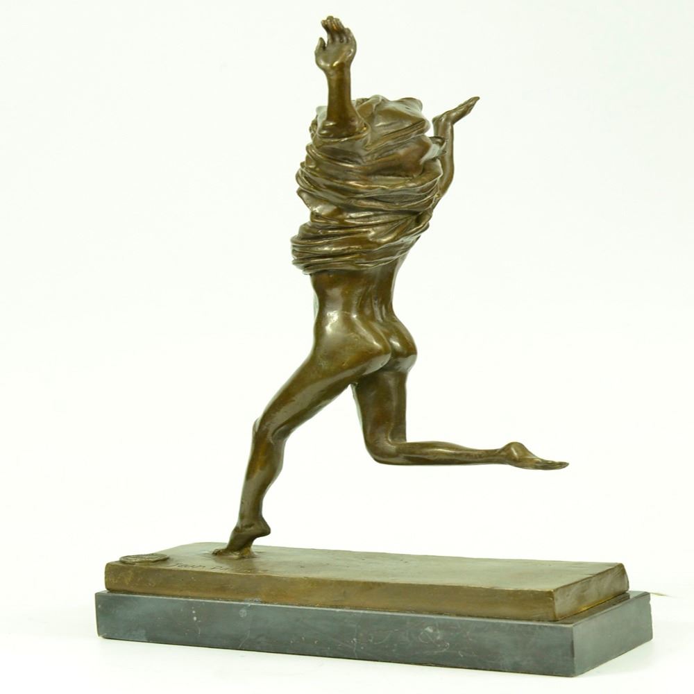 The nude woman runs through the street enveloped in a cloth over her head. Her left hand peaks through the top of the fabric. Her pointed legs stretch in opposite directions. One long leg extends vertical as the other is tip toed on the ground, both toes pointed, making a 90 degree angle. It is a piece show casing graceful yet barricaded woman. This Sculpture was crafted using the lost wax method and is mounted on a marble base. Bronze Dimensions with Marble Base: Height 15 X Width 9 inches. Weight: 10 LBS.