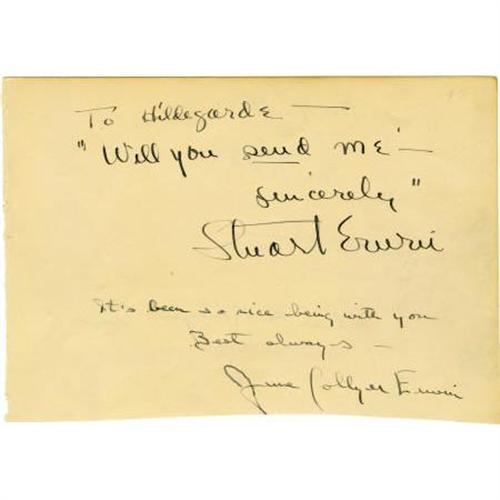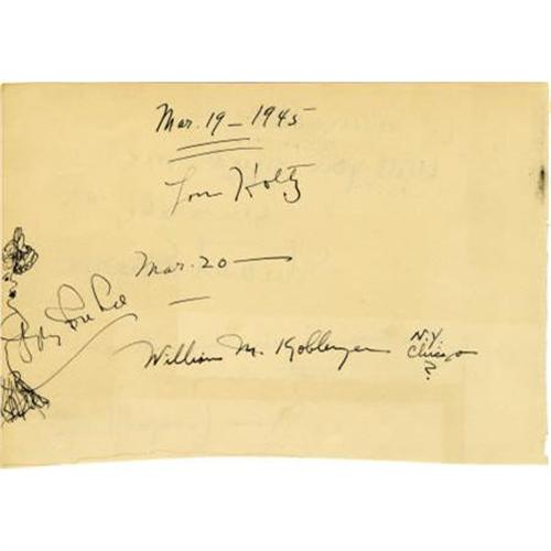 <B>Gypsy Rose Lee Autograph.</B></I> A 9.5" x 6.5" sheet of heavy paper with various signatures, including an autograph by Gypsy Rose Lee (accompanied by a doodle of her). Additionally, Stuart and June Collyer Erwin signed the back of the sheet. In Very Fine condition with mild wear and toning along the edges.<BR><BR><b>Shipping:</b> Flat Material, Small (<a target="_blank" href="http://www.heritageauctions.com/common/shipping.php">view shipping information</a>)