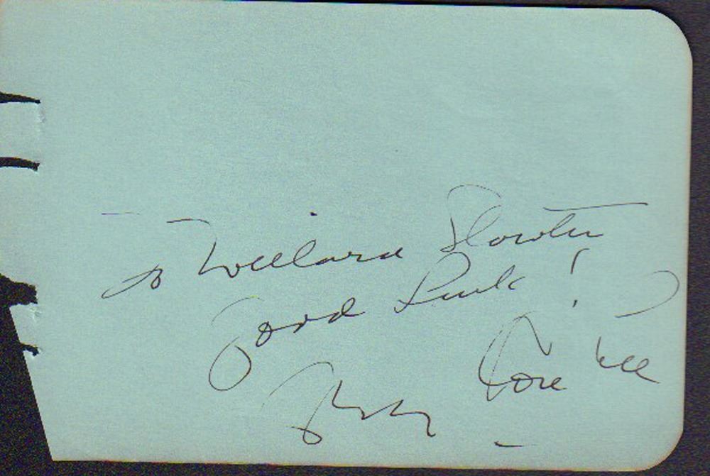Autograph book page signed by Gypsy Rose Lee. It was inscribed to Willard Slawter. All items come with a certificate of authenticity good for the life of the piece.