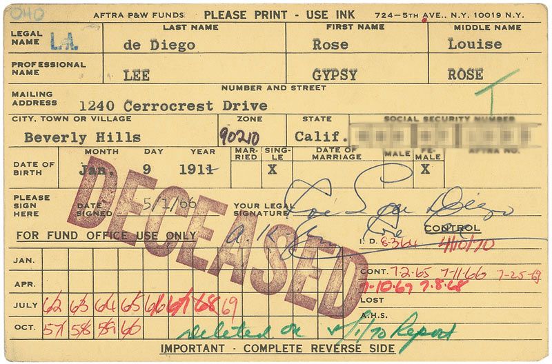 Rare yellow AFTRA union P&W benefits card, one page, both sides, 6 x 4, dated May 1, 1966. Pension and Welfare benefit card is filled out in type, listing her full name, Beverly Hills address, birthdate, and Social Security number. Signed at the bottom in blue ballpoint with her full and stage names, “Rose L. de Diego, A. K. Gypsy Rose Lee.” On the reverse, her son is listed in type as the recipient of her death benefits. Stamped across the front of the card is “Deceased.” Several office notations, most of signed stage name obscured by stamp and type, and a staple hole to top left, otherwise fine condition.