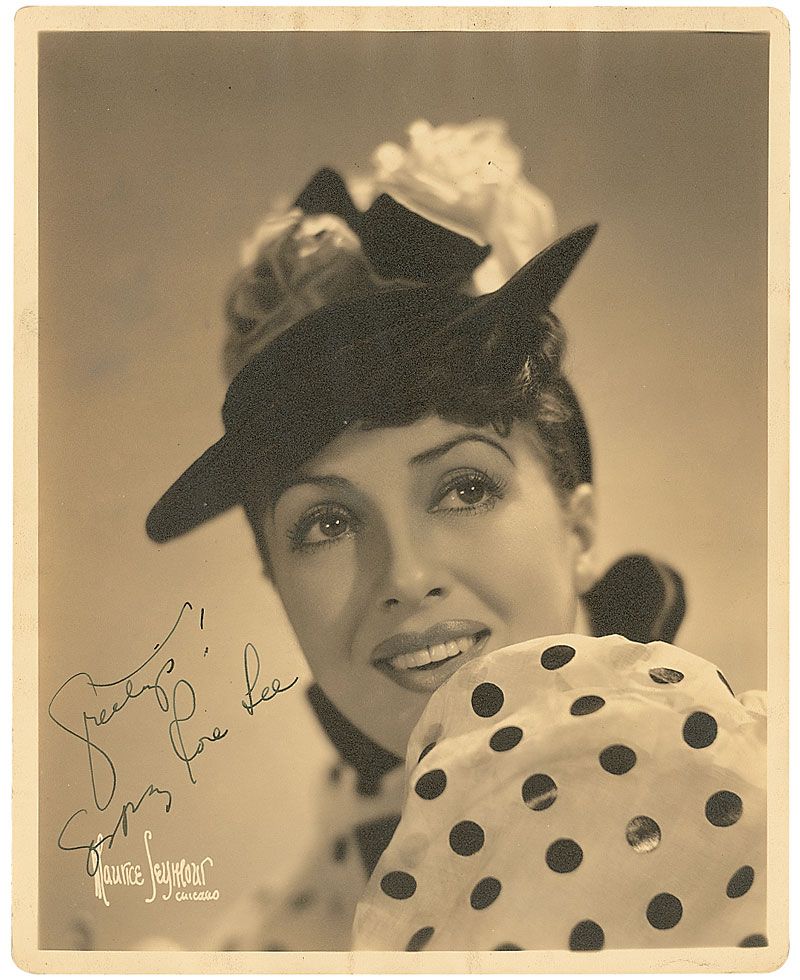 Vintage matte-finish 8 x 10 portrait of Lee by Maurice Seymour, signed in fountain pen, “Greetings! Gypsy Rose Lee.” In very good condition, with some wear to corner tips, moderate rippling to edges, and light silvering to dark areas of the image.