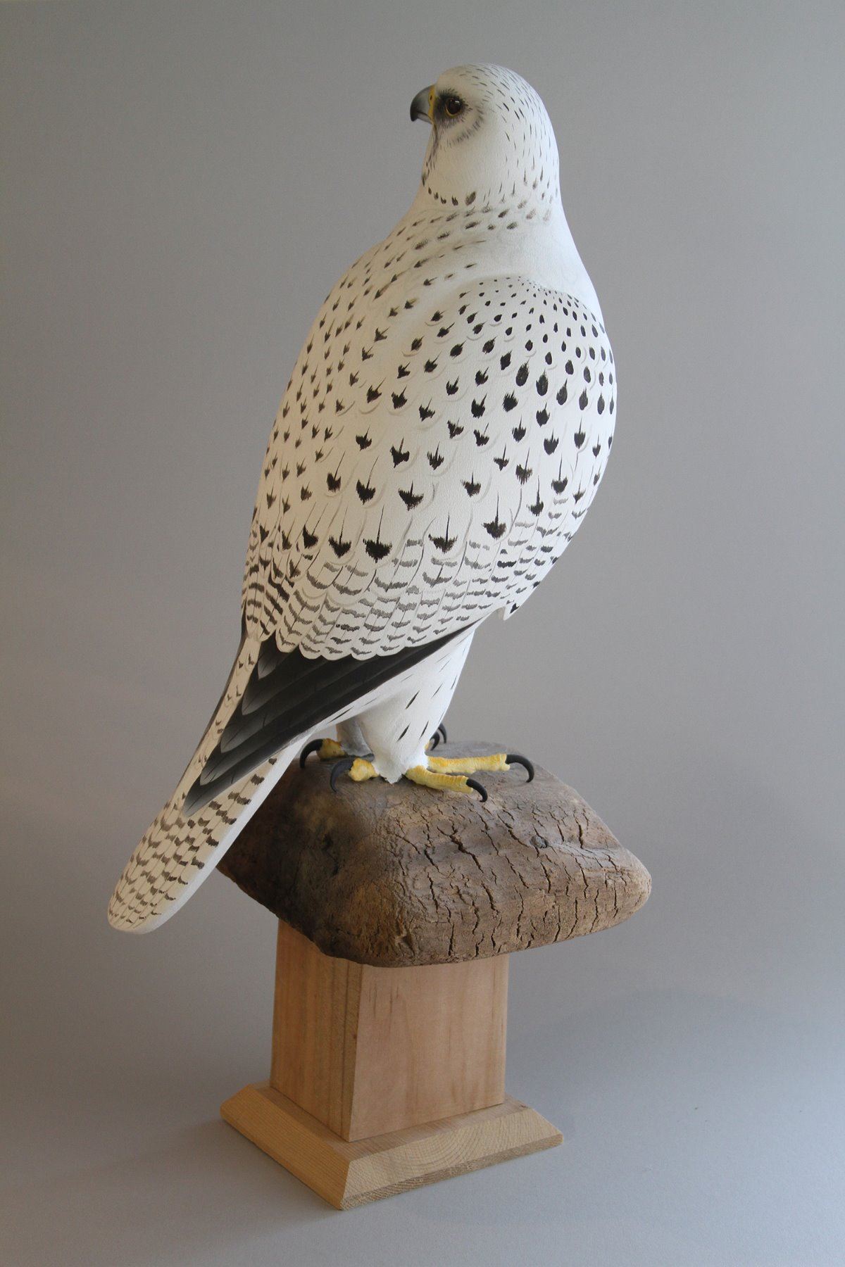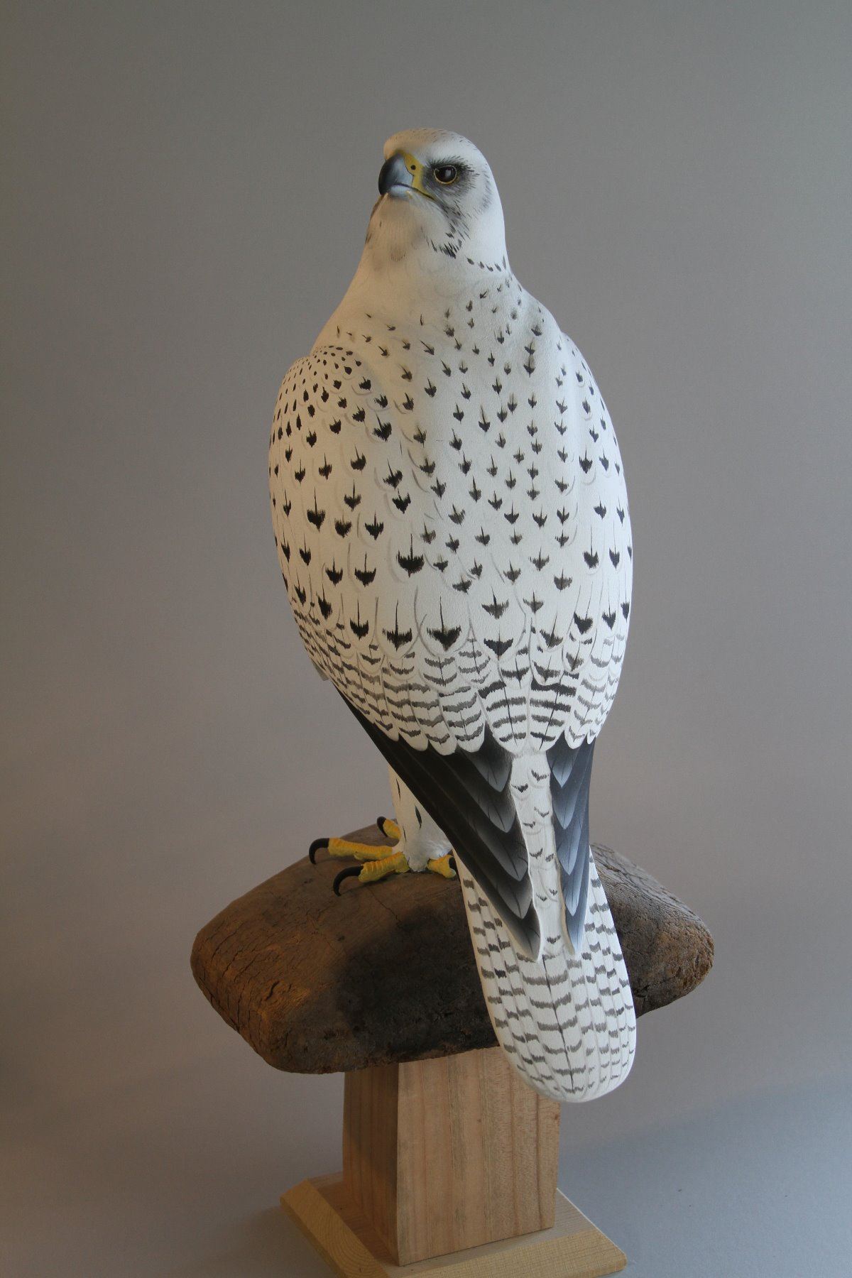 Artist: Andy White. Title: Gyrfalcon. Artwork size: 21" x 9" x 9". Frame: N/A. Medium: Acrylic on hand-carved basswood. Artist's description: This piece is the result of my attempt to capture the stateliness of this majestic bird using detailed brush work and a relaxed posture with a head position turned slightly skyward.