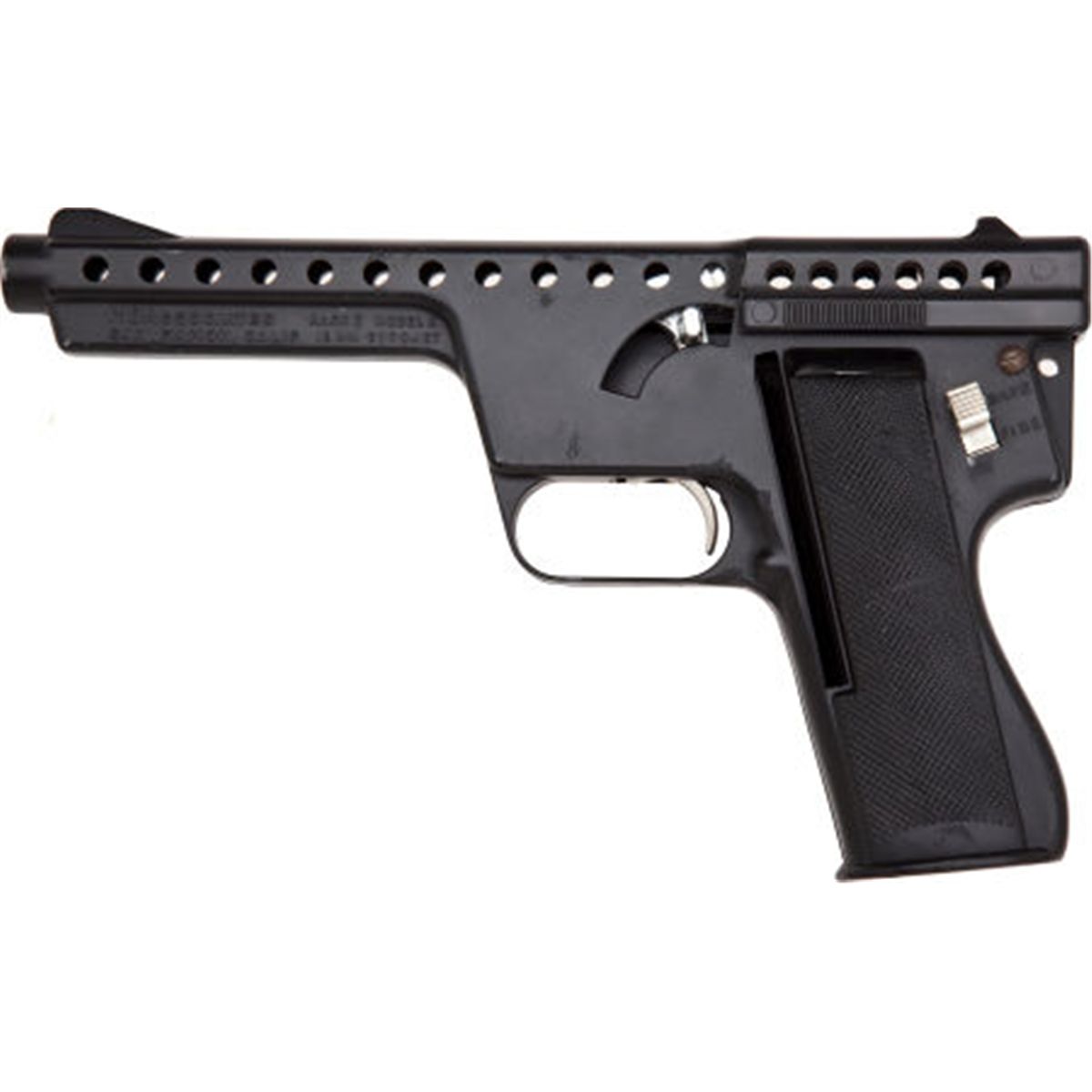 Gyrojet Pistol Mark I Model B by MBA Associates. Unserialized, 13mm, 5-inch barrel, black finish. Semi-automatic pistol designed for self-propelled rocket pistol. Condition: Excellent retaining approximately 95% original black finish. Some losses to top of frame that appear to be scattered chips along the seam. Light handling wear and scuffs on high points and on grip.NRA FIREARMS FOR FREEDOM PROGRAM