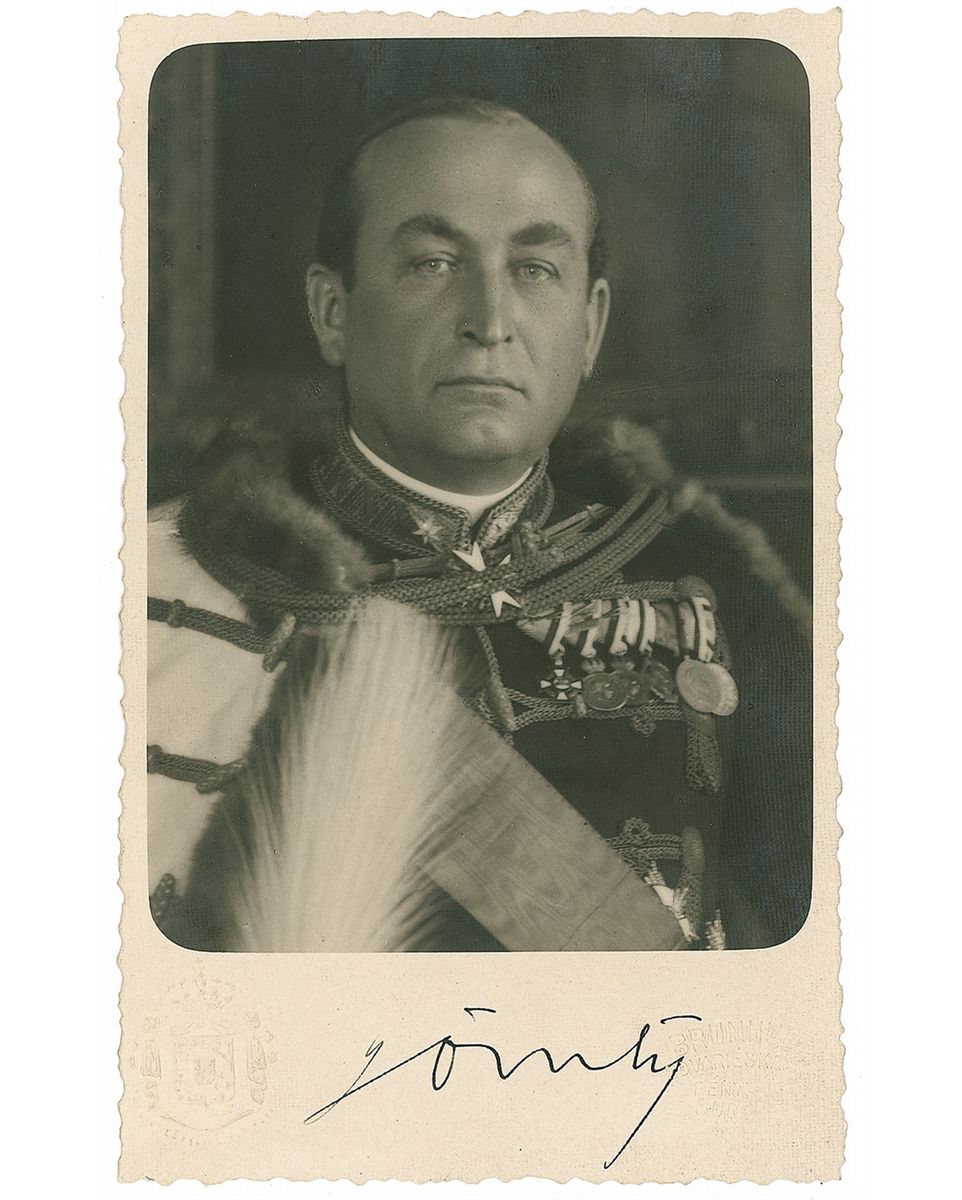 Conservative prime minister of Hungary from 1932 to 1936. Vintage 3.5 x 5.5 postcard photo by Brunhuber of Budapest (and so stamped on the reverse), signed in the lower border in fountain pen. In fine condition, with mounting remnants on reverse. Provenance: The Barry Hoffman Collection.