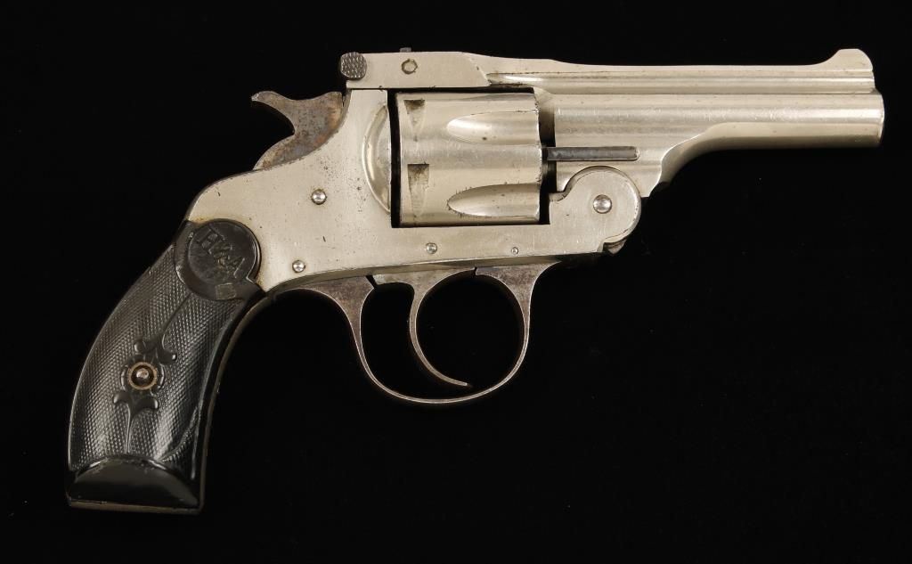 Double action six-shot top break revolver. Nickel finish with most remaining. Black hard rubber grips in good condition. The barrel is 3-1/8" long and has strong rifling with some pitting. The cylinder may not be original to this frame. The cylinder retainer does not fit the cylinder and the ejection does not function as it should. Condition is good. *Curio & Relic*