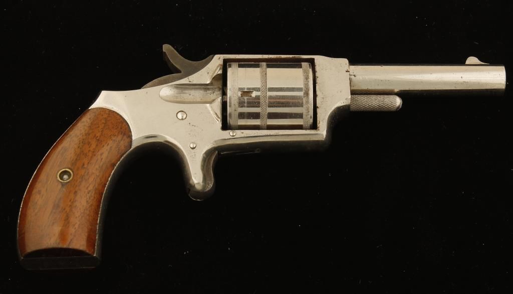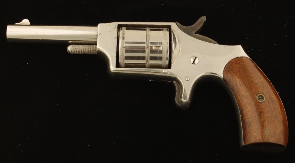 Single action spur trigger 5 shot revolver with 2-17/8" round barrel. Nickel finish, square butt wood grips and fixed sights. Good markings and very good working action. Condition: Very good to excellent showing 90% original finish and grips are very good. *Antique Firearm*