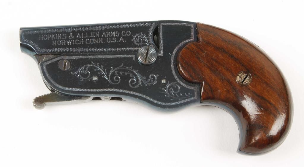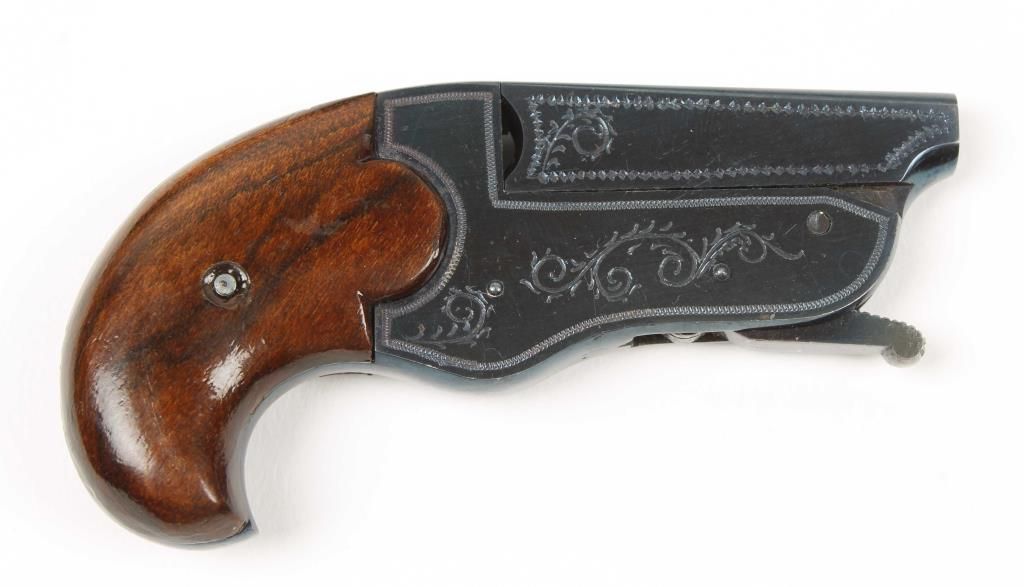 Small frame miniature of a single shot derringer with 1-3/4" barrel. Blued finish, lightly scroll engraved frame, wood grips, folding trigger and no sights. Barrel tips forward for loading. Good bore and action. Condition: Very good. *Modern Firearm*