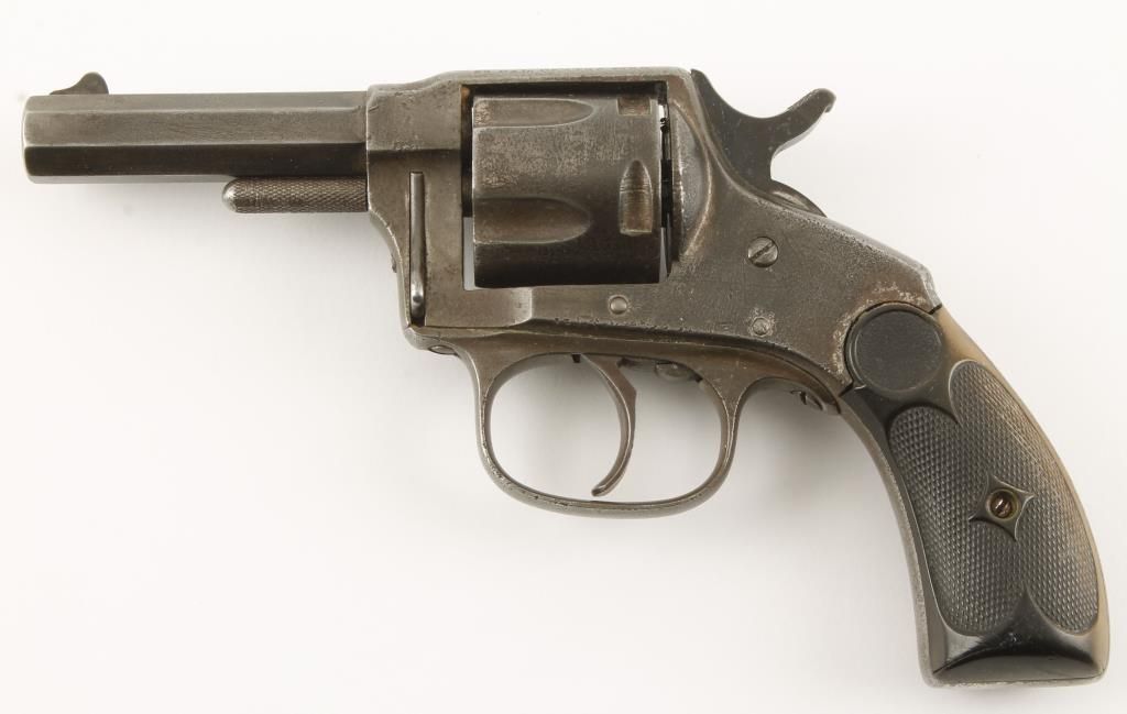 Early model double action 5 shot revolver with 2-7/8" octagon barrel. Blued finish, checkered plastic grips, side loading gate, and fixed sights. Good bore and good working action. Condition: Fair to good showing heavy pitting scattered throughout metal surfaces, and right grip panel shows loss at base. *Antique Firearm*
