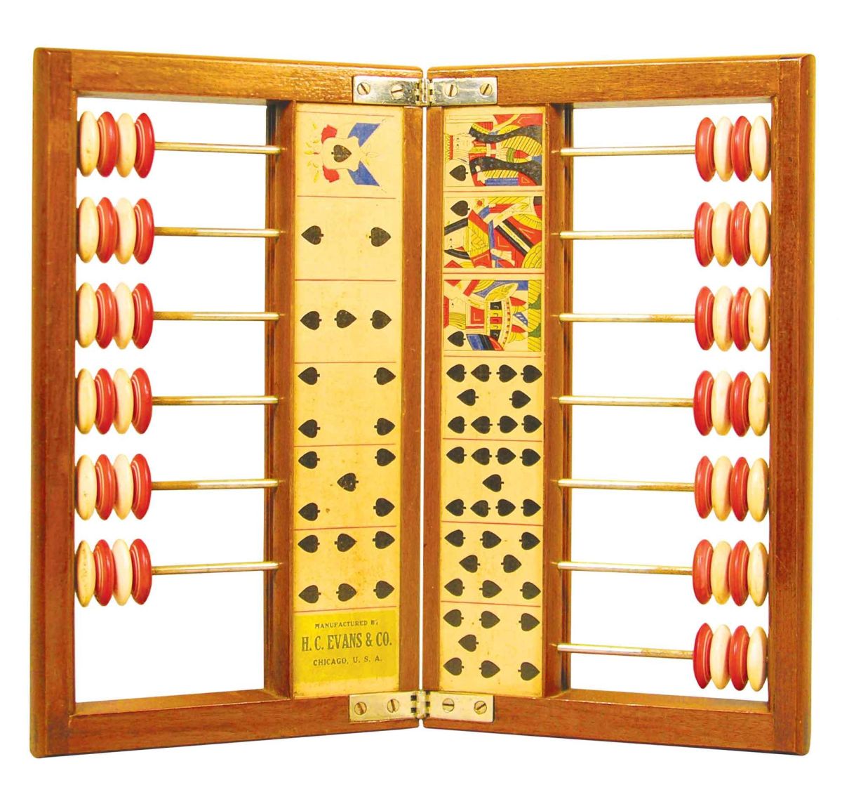 H.C. Evans & Co. Faro Case Keeper, Chicago. Walnut frame, paper court card strips and ivory beads. Some wrinkles to card strips otherwise very good condition. 13 1/4 X 11 1/2 inches.