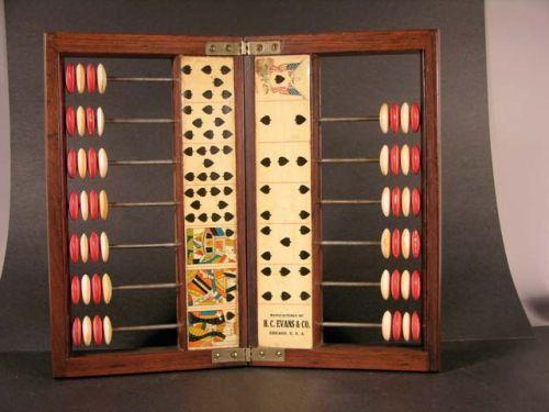 Faro casekeeper, celluloid cards with ivory beads. H.C. Evans & Co., Chicago, USA - cherrywood case, 13.25" x 11.5", Minor staining, very good cond.