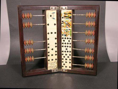 Faro casekeeper, celluloid cards with ivory beads. H.C. Evans & Co., Chicago, USA - cherrywood case, 13.25" x 12", missing one row of beads, minor staining. Otherwise good cond.