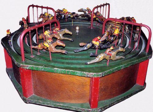 H. C. Evans “Race Course” horse race arcade game. This is the large, extremely rare 20 horse version of Evans’s popular gambling device. This game measures over 5 feet in diameter and features a crank and free-wheeling device to keep the carved horses and jockeys spinning around the track until the operator stops cranking. When the horses come to a rest, the closest one before the post wins. Circa 1910.
