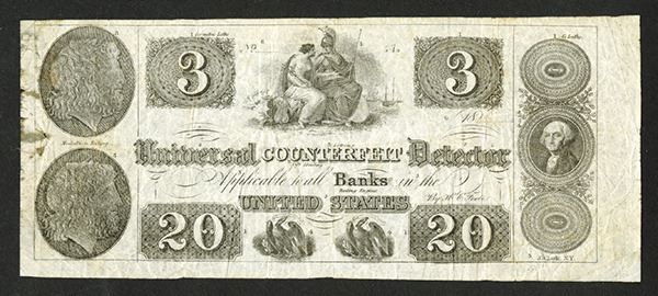 New York, Security printer sample note with multiple vignettes, allegorical figures, cameo portraits and George Washington portrait as well as numeral counters, Each vignette has a small number evidently to help in the selection of designs. Fine condition with stains on the left margin. Rare and attractive early sample note.