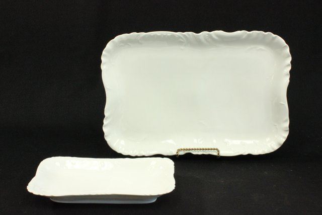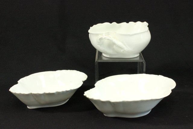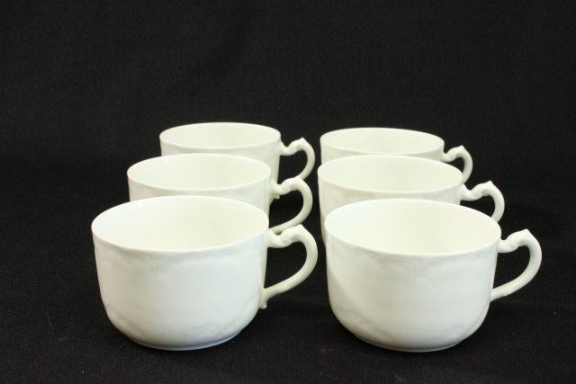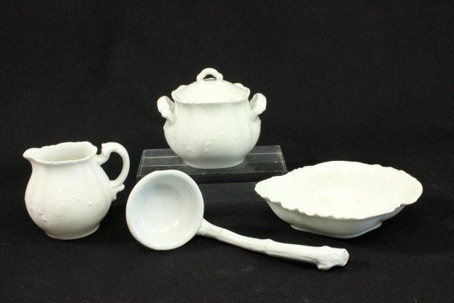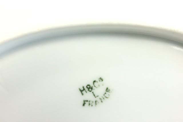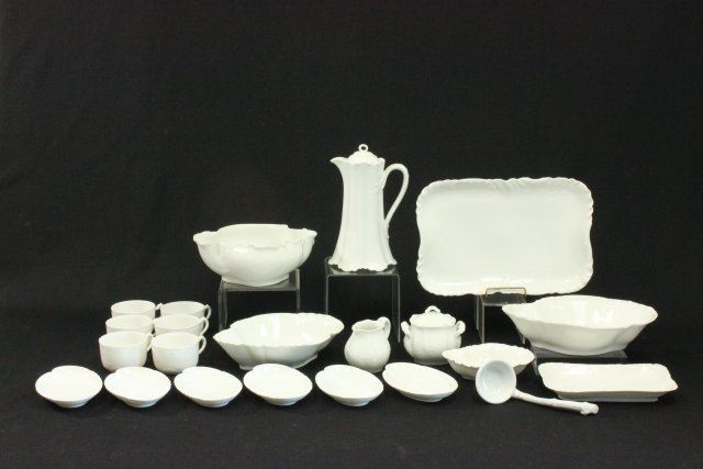 Tea cups stamped Haviland, France, 4 serving bowls, ladle, pot, sugar, creamer on tray, 6 cups, saucers and tray. From a NYC collector's 40 year compilation.