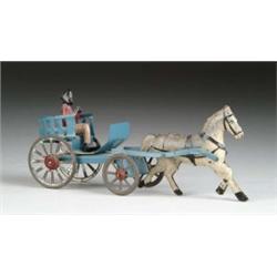 H.D. CART W/BLACK RIDER. U.S.A. Early all-tin toy features trotting horse pulling black rider in blue cart. SIZE: 7 1/2” l. CONDITION: Not guaranteed all-original. Horse and underside of toy appear to be repainted. WP 1-3474 (200-400)