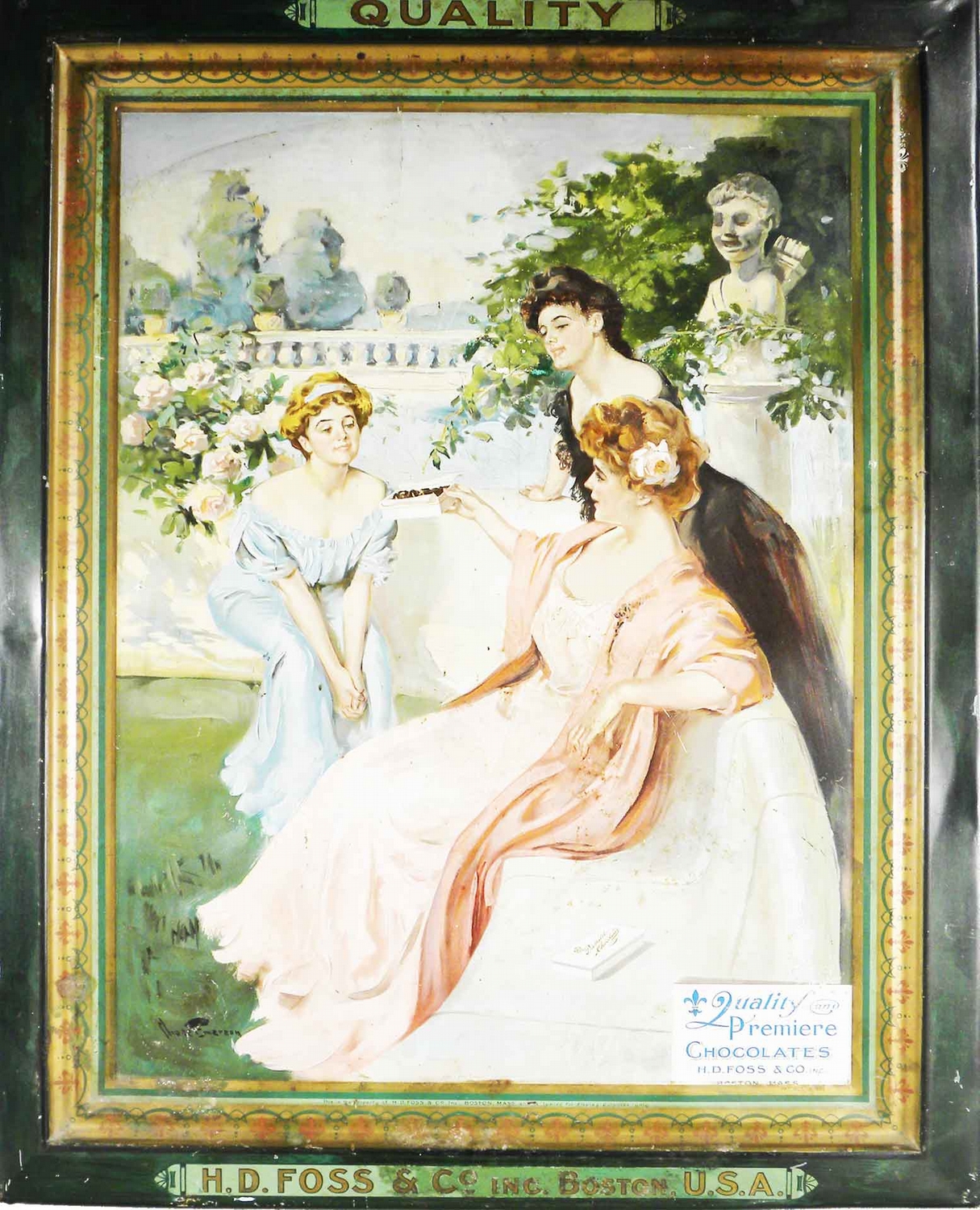 H.D. Foss & Co. Premiere Chocolates Self Framed Tin Sign. Chase Emerson artist. 1905 Beach Art Display Coshocton, OH Lithographer. A few dents, a crease, some minor staining and scratches otherwise good condition. 22 1/4 X 28 1/4 inches.