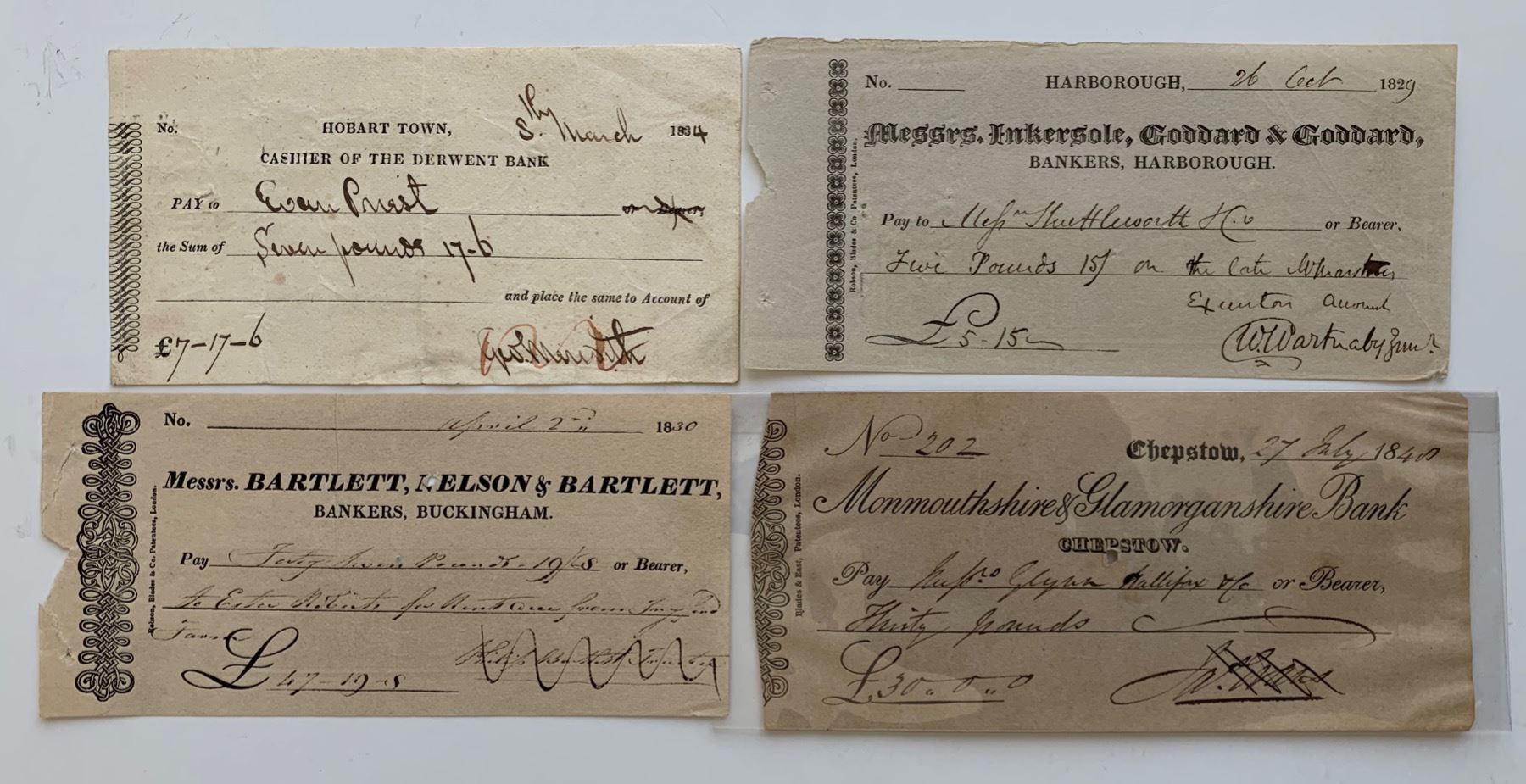 Inkersole, Goddard & Goddard, Harborough, 1829; Bartlett, Nelson & Bartlett, Buckingham, 1830; Monmouthshire & Glamorganshire Bank, Chepstow, 1848; Derwent Bank, Hobart Town, 1834.