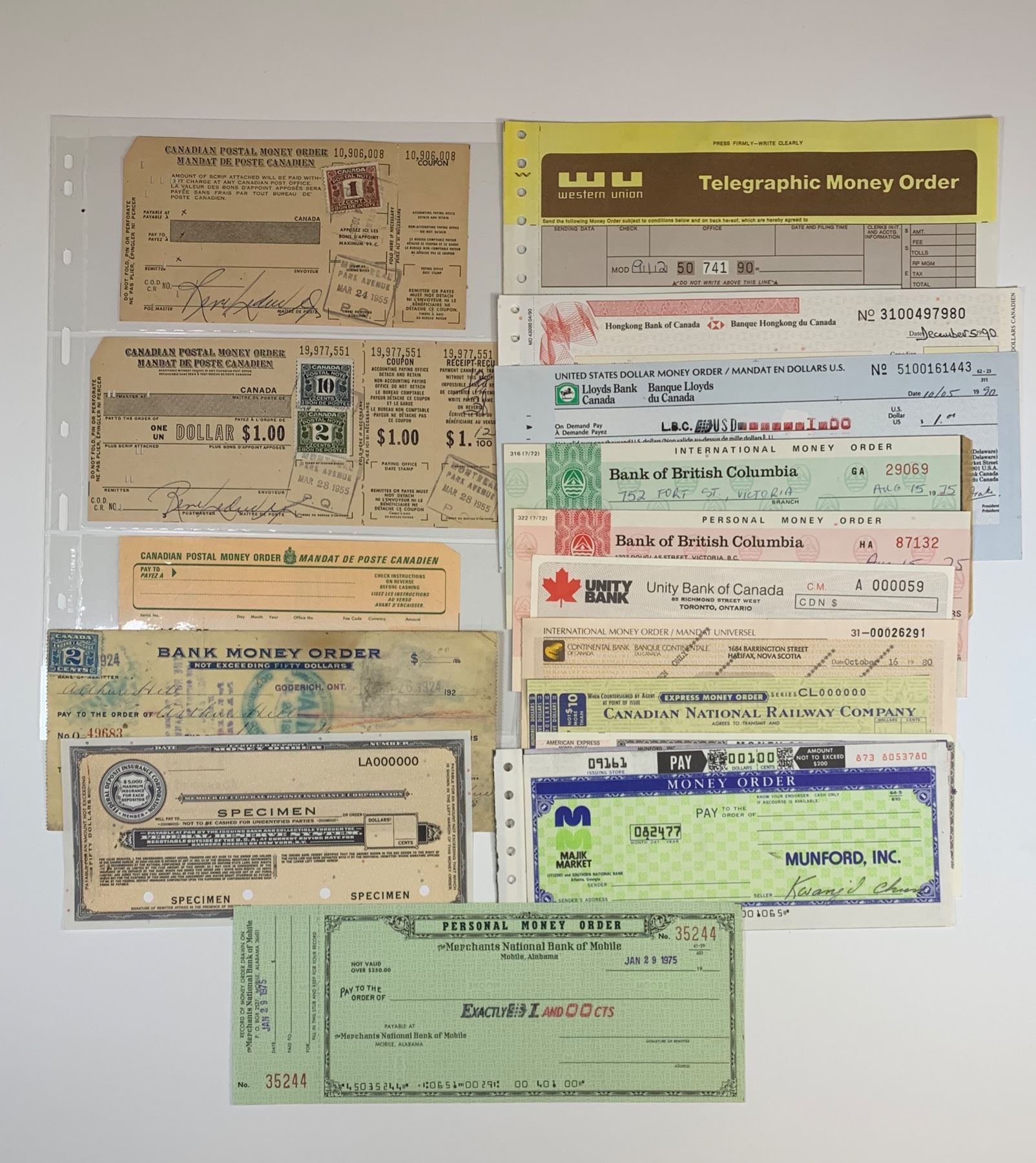 A nice group of money orders from short-lived Canadian banks: Continental Bank of Canada, 1980, typewritten "Specimen Only"; Lloyds Bank of Canada 1990; Unity Bank of Canada; two Hong Kong Bank of Canada, 1990; Bank of British Columbia, two different, 1975; Union Bank of Canada, Goderich, 1924. Other money orders include Canadian National Railway Co. Specimen; American Express; Federal Reserve (USA), Specimen; Majik Market; Merchants National Bank of Mobile, 1975; Western Union Telegraphic Money Order. Also three Canada Postal Money Orders, amounts 1¢, $1.12 and $1.00. Sixteen items, an unusual collection of ephemera. Generally an exceptionally clean lot but the used Union Bank of Canada piece appears to have become wet at some time - but has anyone ever seen a better one?