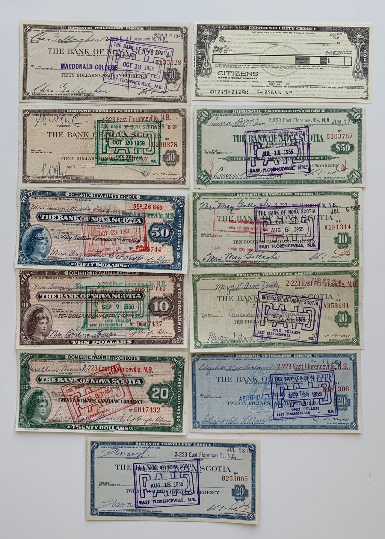 Bank of Nova Scotia, collection of eleven used travellers cheques, 1955 - 1961. All are different, although a few differ only in the printed general manager's signature. Also one unused Citizens Bank and Trust Co., Chicago, "security check".